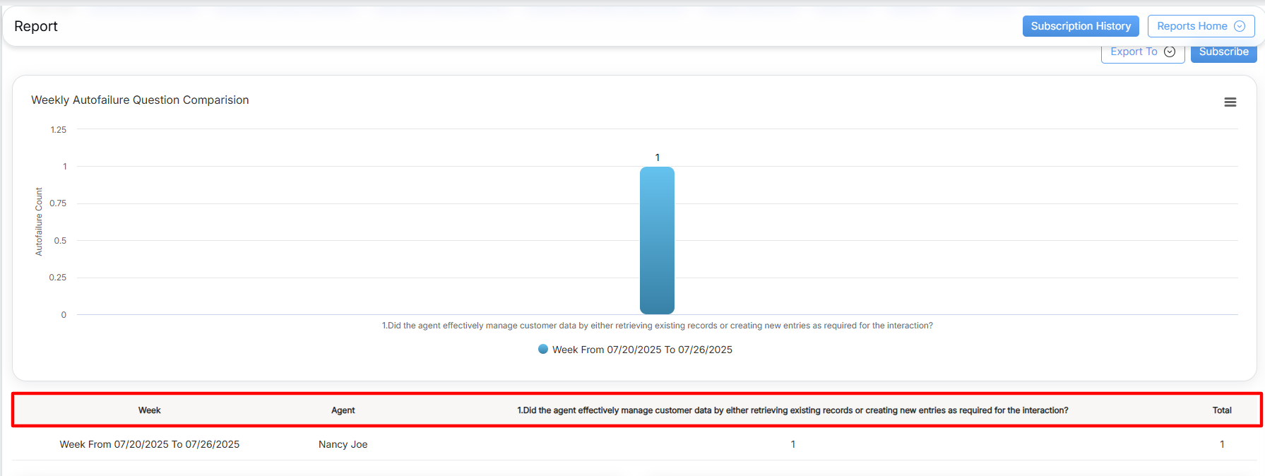 The Weekly/Monthly QA Alert by Agent displays the weekly QA Alert summary for an agent by question. It also displays the question level and agent level QA alert count.