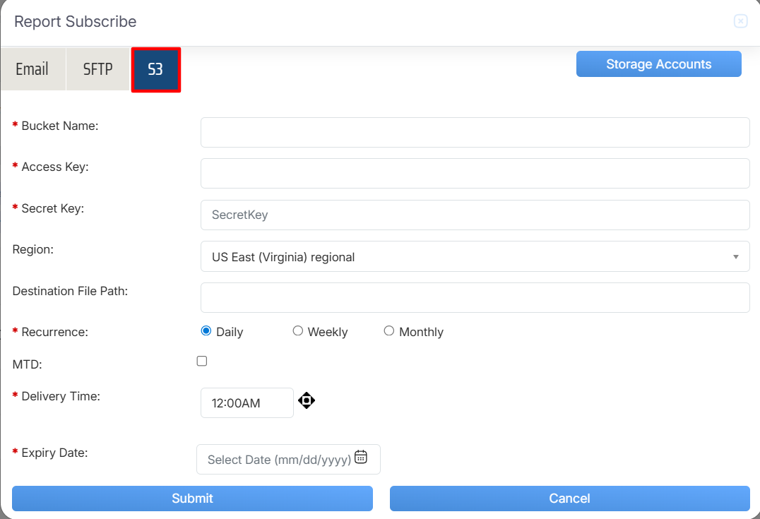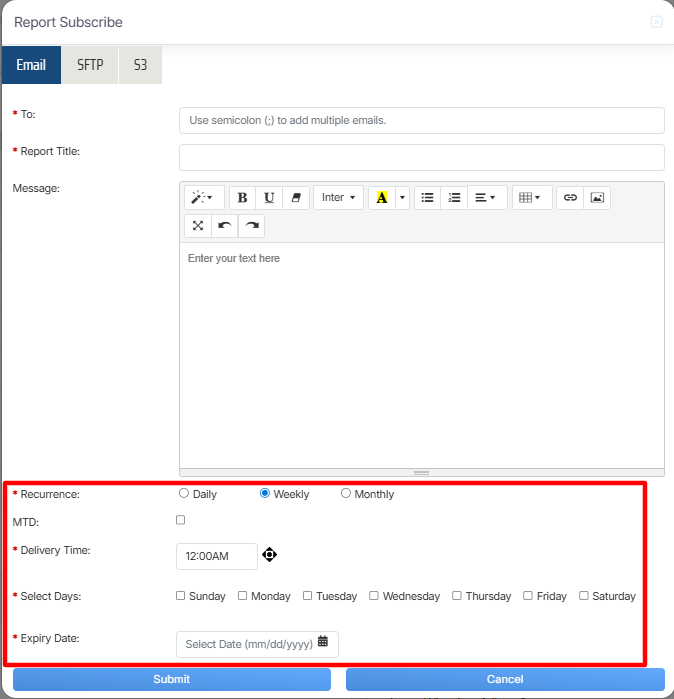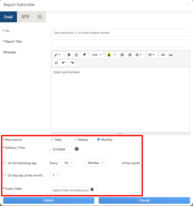 Once the necessary details are configured, click on the Submit button to subscribe the report or click on the Cancel button to discard the process.