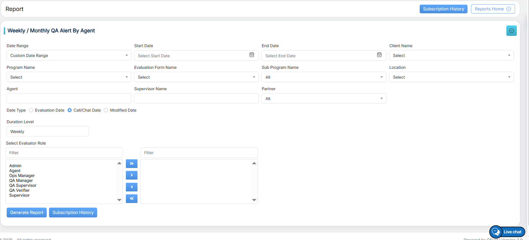Evaluation Date: Select the radio button to search on the basis of the Evaluation date. Call/Chat Date: Select the radio button to search on the basis of call/chat date. Modified Date: Select the radio button to search on the basis of the evaluation form modified date. |