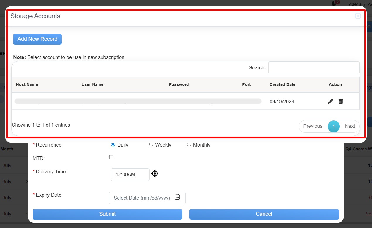 The Storage Account serves as a centralized repository for securely storing and managing evaluation-related data. It includes key details such as Host Name, User Name, Password, Port, Created Date, and Action, and provides users with the ability to add and maintain records. This system ensures that all evaluation data is organized, easily accessible, and securely stored for efficient reference and processing in the future.