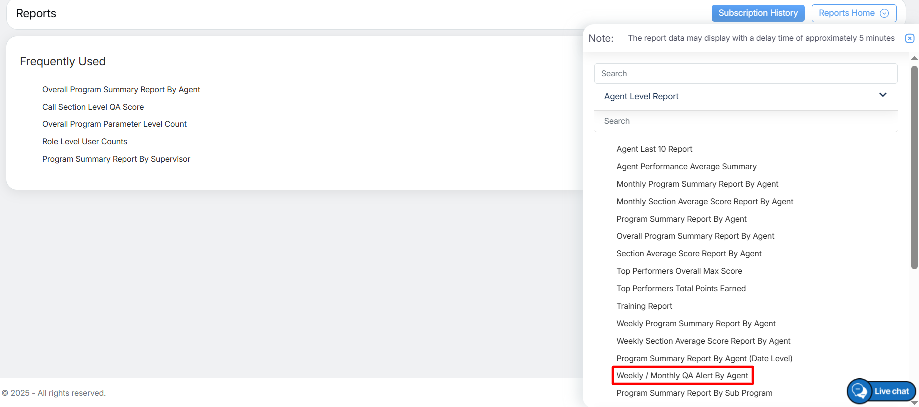 To view this report, select Reports > Report > Agent Level Report > Weekly/Monthly QA Alert by Agent.