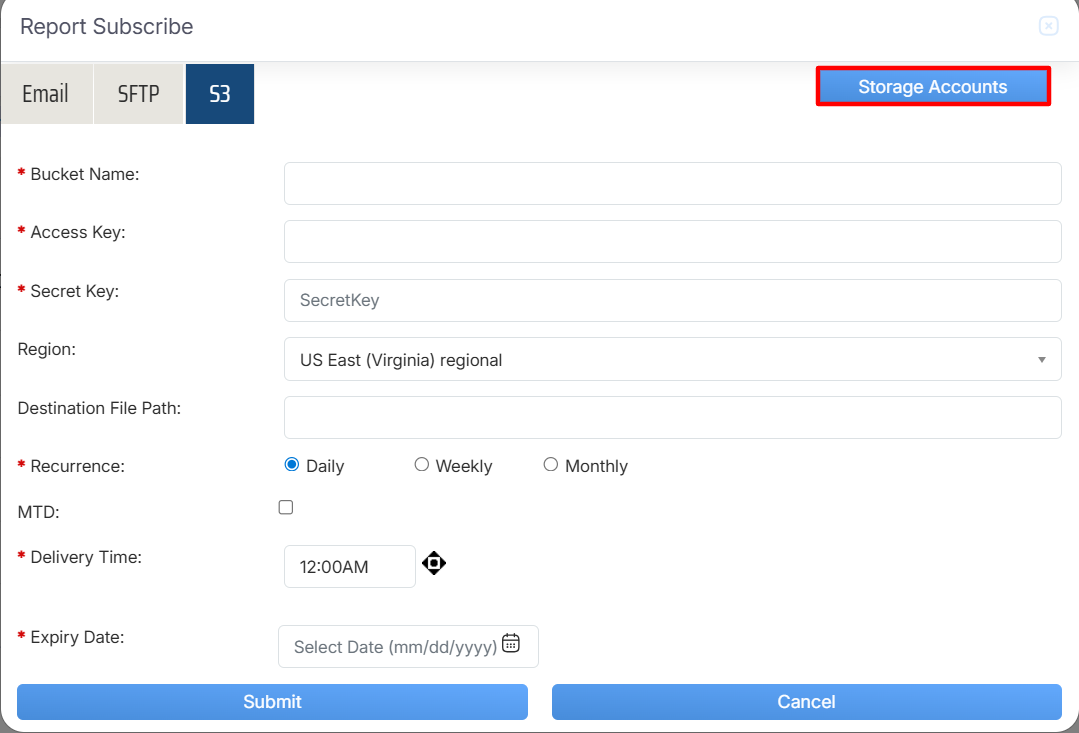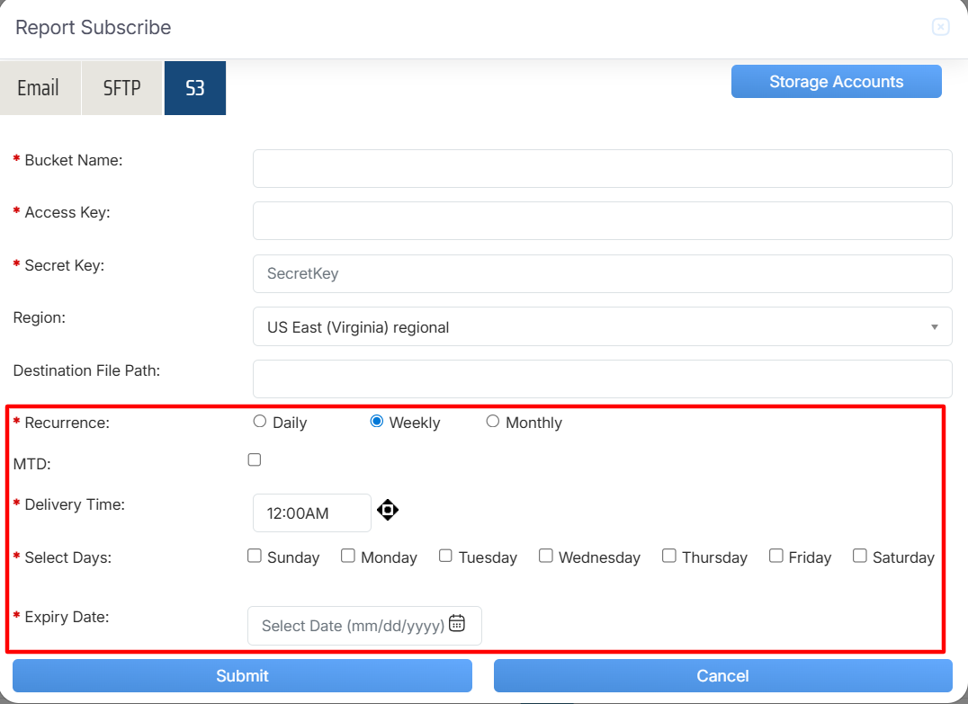 Once the necessary details are configured, click on the Submit button to subscribe the report or click on the Cancel button to discard the process.