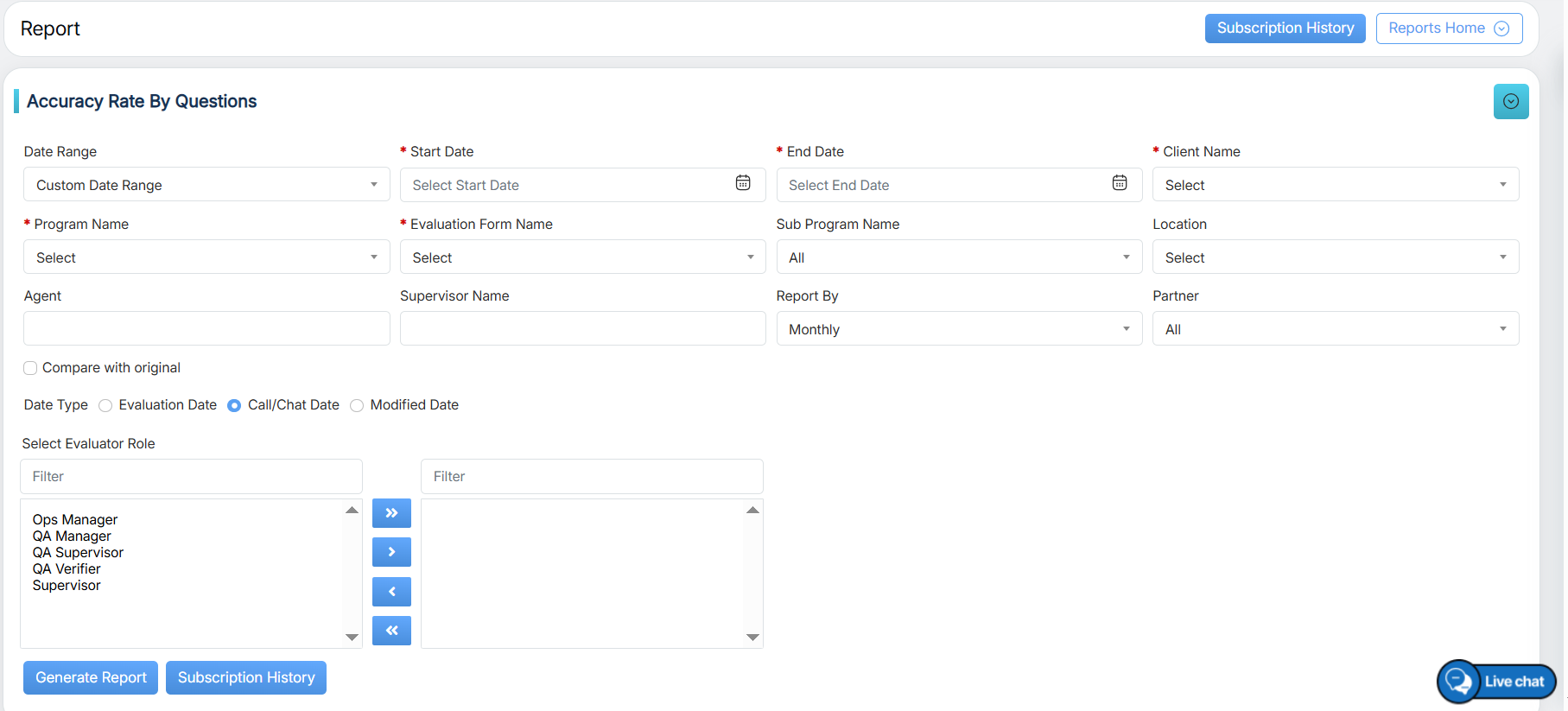 Evaluation Date: Select the radio button to search on the basis of the Evaluation date. Call/Chat Date: Select the radio button to search on the basis of the call/chat date. Modified Date: Select the radio button to search on the basis of the evaluation form modified date. |