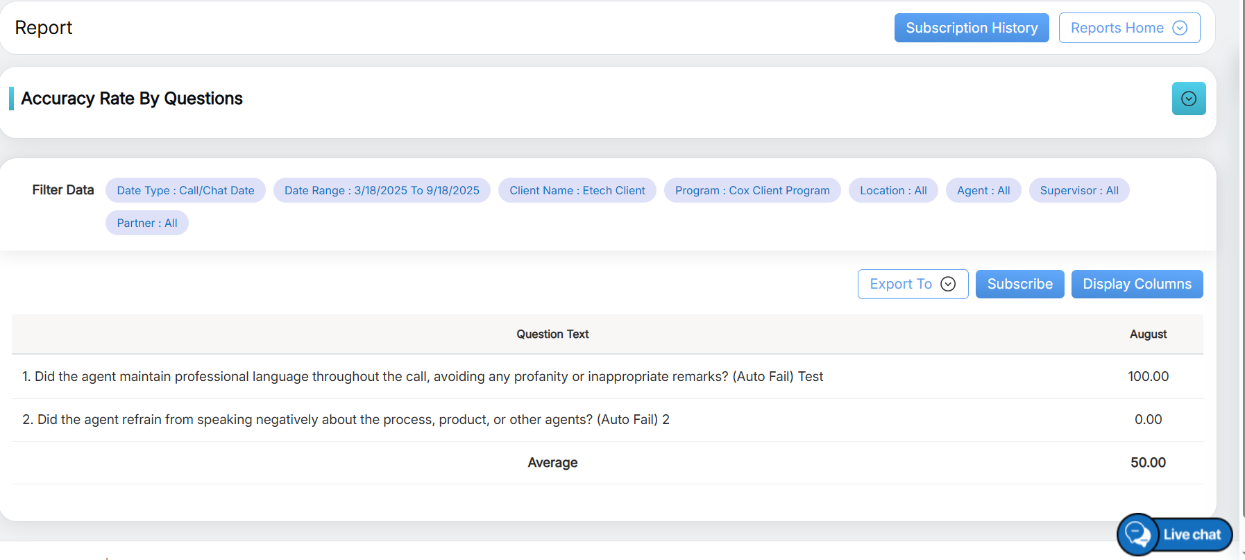 Accuracy Rate by Questions identifies the questions having major opportunities and strengths. It determines the knowledge gap or understanding of a QA team on particular parameters/questions.
