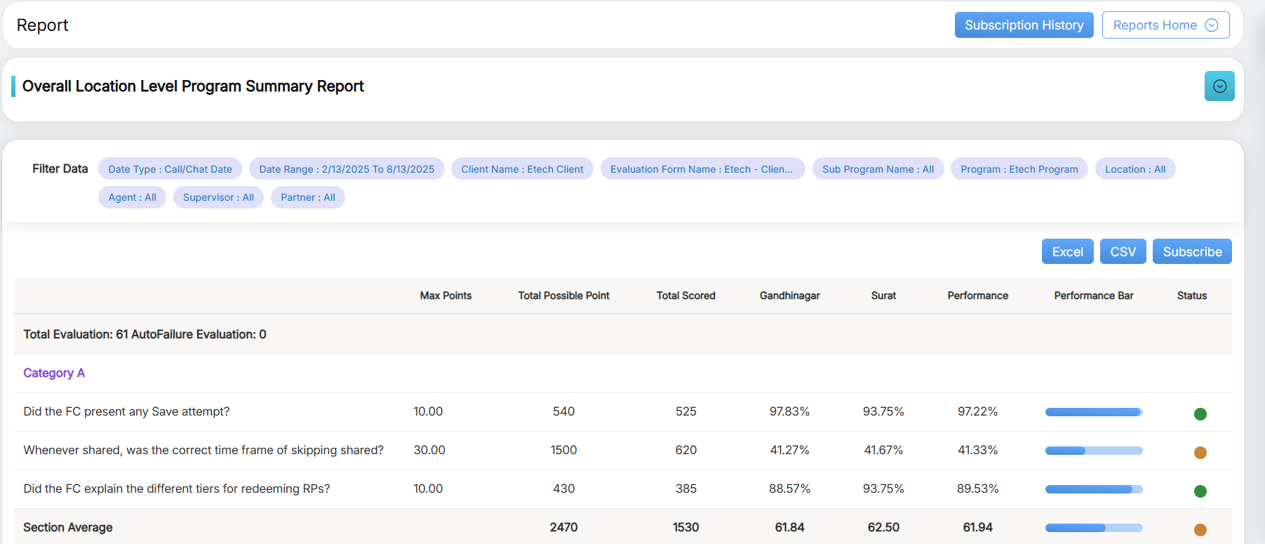 Overall Location Level Program Summary Report displays the weekly performance of the program. This allows to track the weekly QA trend of a specific program.