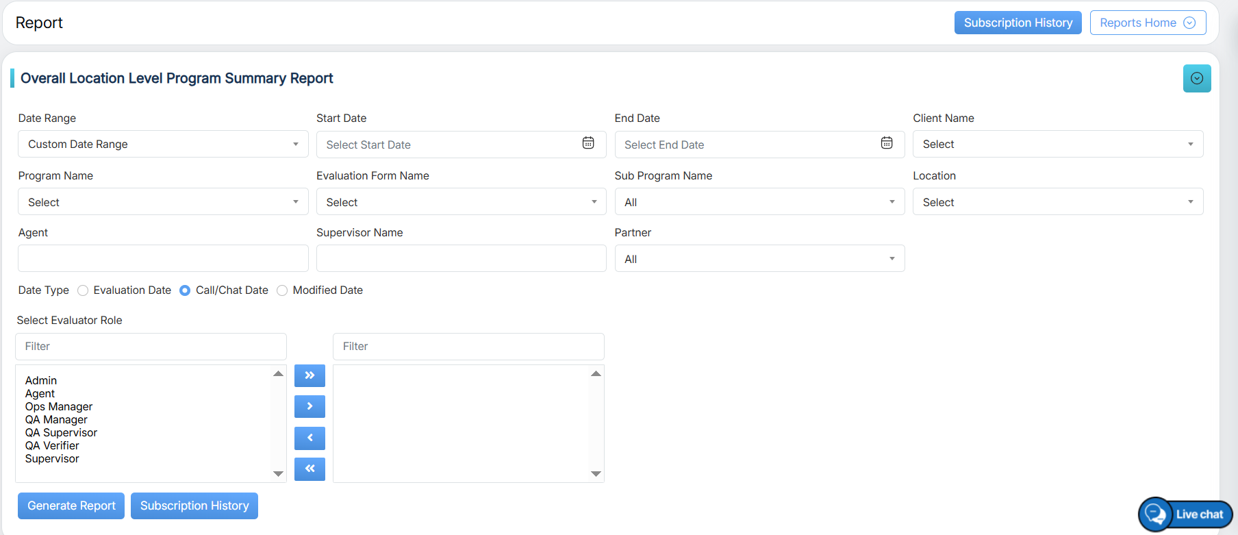 Evaluation Date: Select the radio button to search on the basis of the Evaluation date. Call/Chat Date: Select the radio button to search on the basis of the call/chat date. Modified Date: Select the radio button to search on the basis of the evaluation form modified date. |