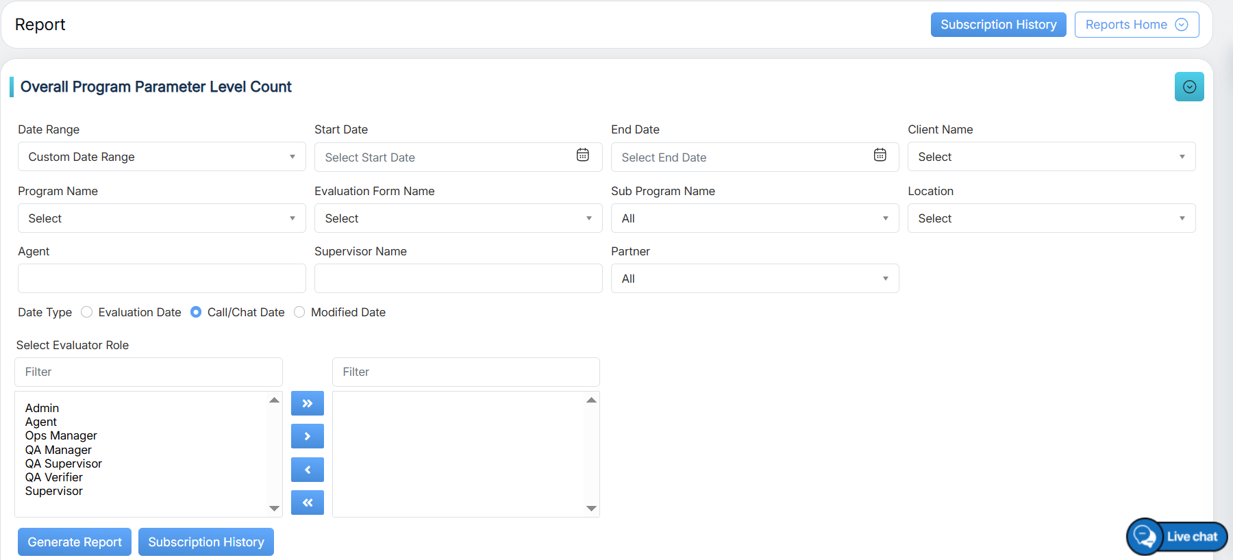 Evaluation Date: Select the radio button to search on the basis of the Evaluation date. Call/Chat Date: Select the radio button to search on the basis of the call/chat date. Modified Date: Select the radio button to search on the basis of the evaluation form modified date. |