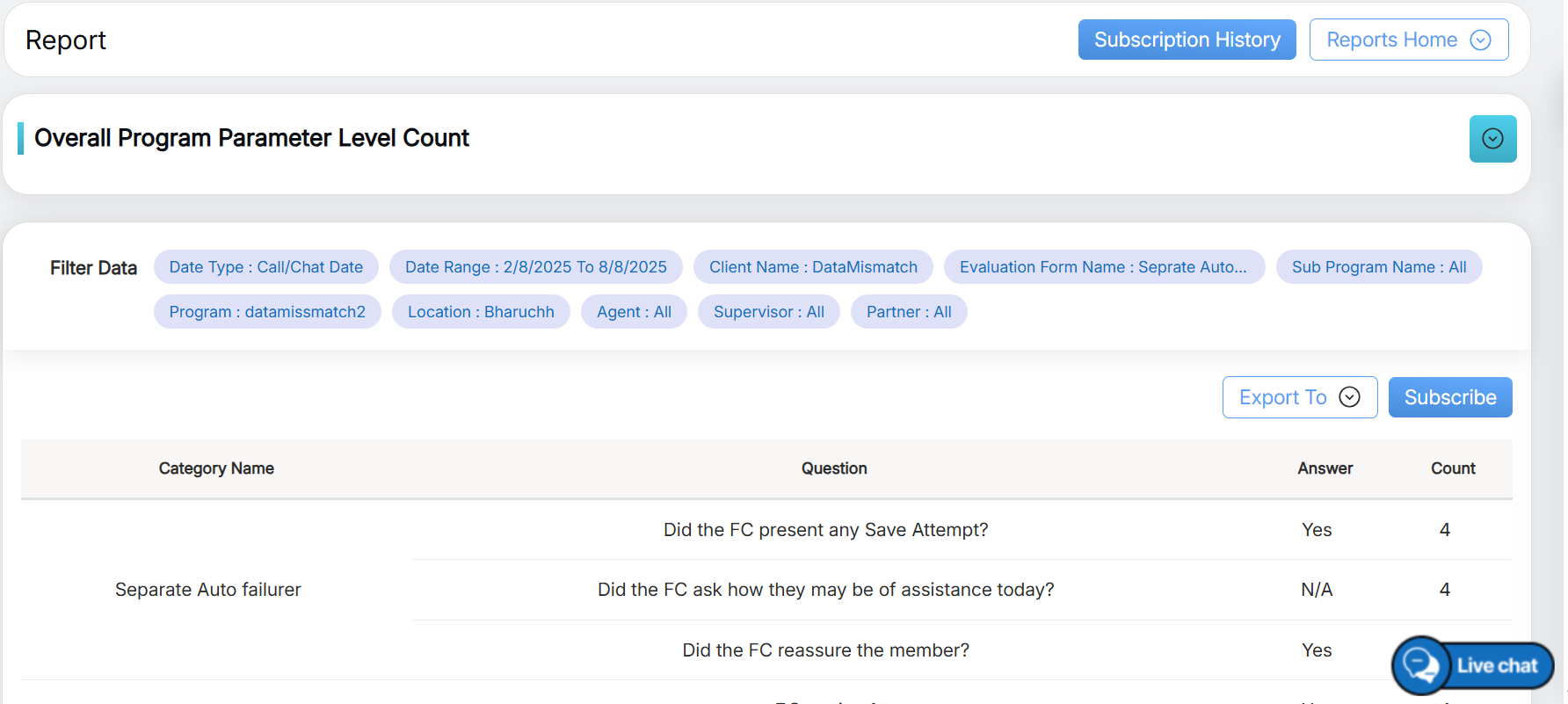 Overall Program Parameter Level Count displays the section-wise QA score of the calls for the selected duration.