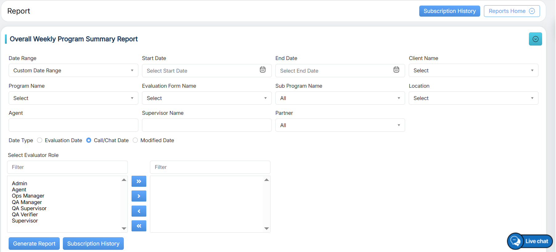 Evaluation Date: Select the radio button to search on the basis of the Evaluation date. Call/Chat Date: Select the radio button to search on the basis of the call/chat date. Modified Date: Select the radio button to search on the basis of the evaluation form modified date. |