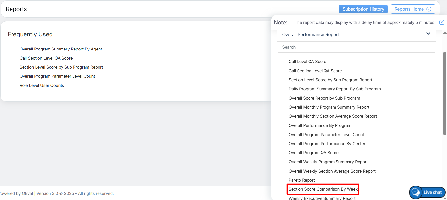 To view this report, select Overall Performance Report > Section Score Comparison By Week.