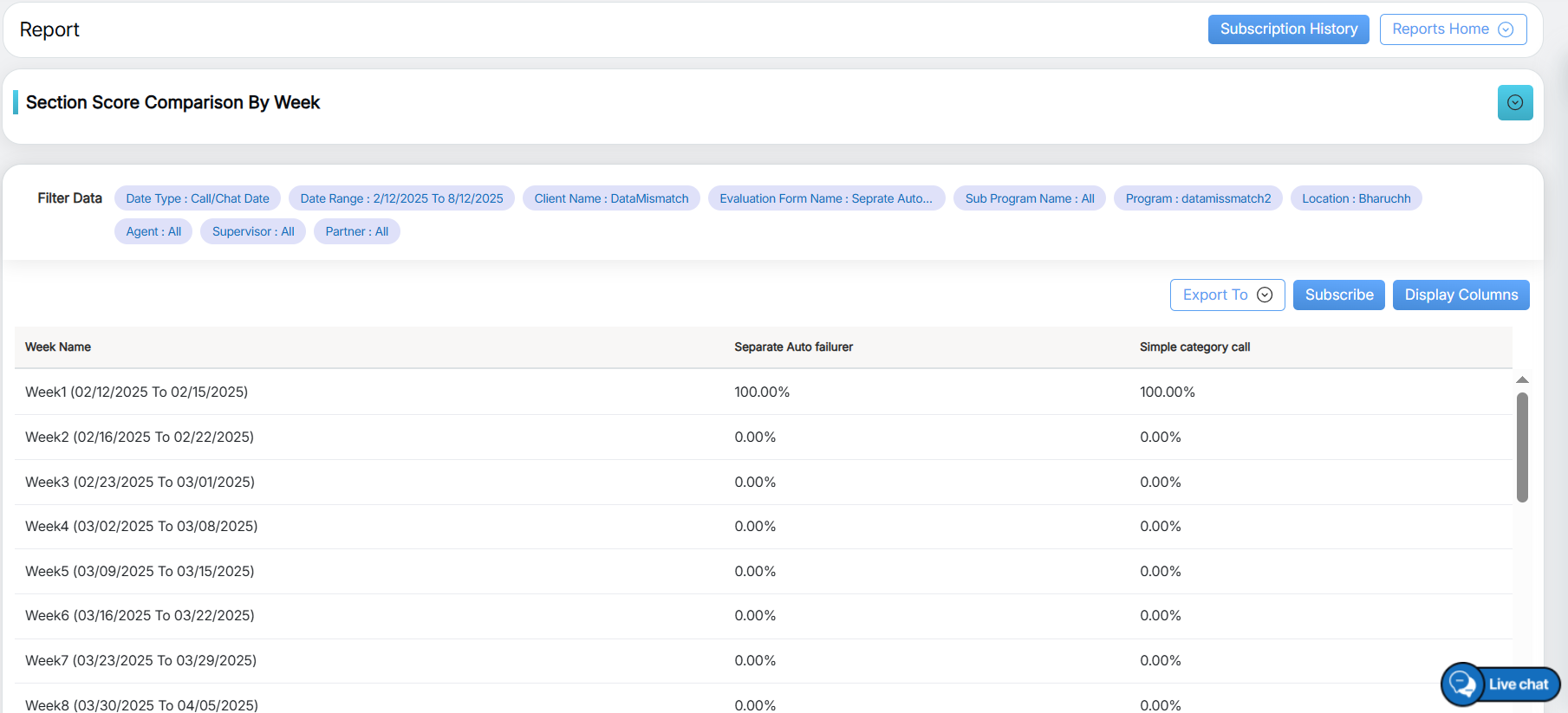 To view this report, select Overall Performance Report > Section Score Comparison By Week.