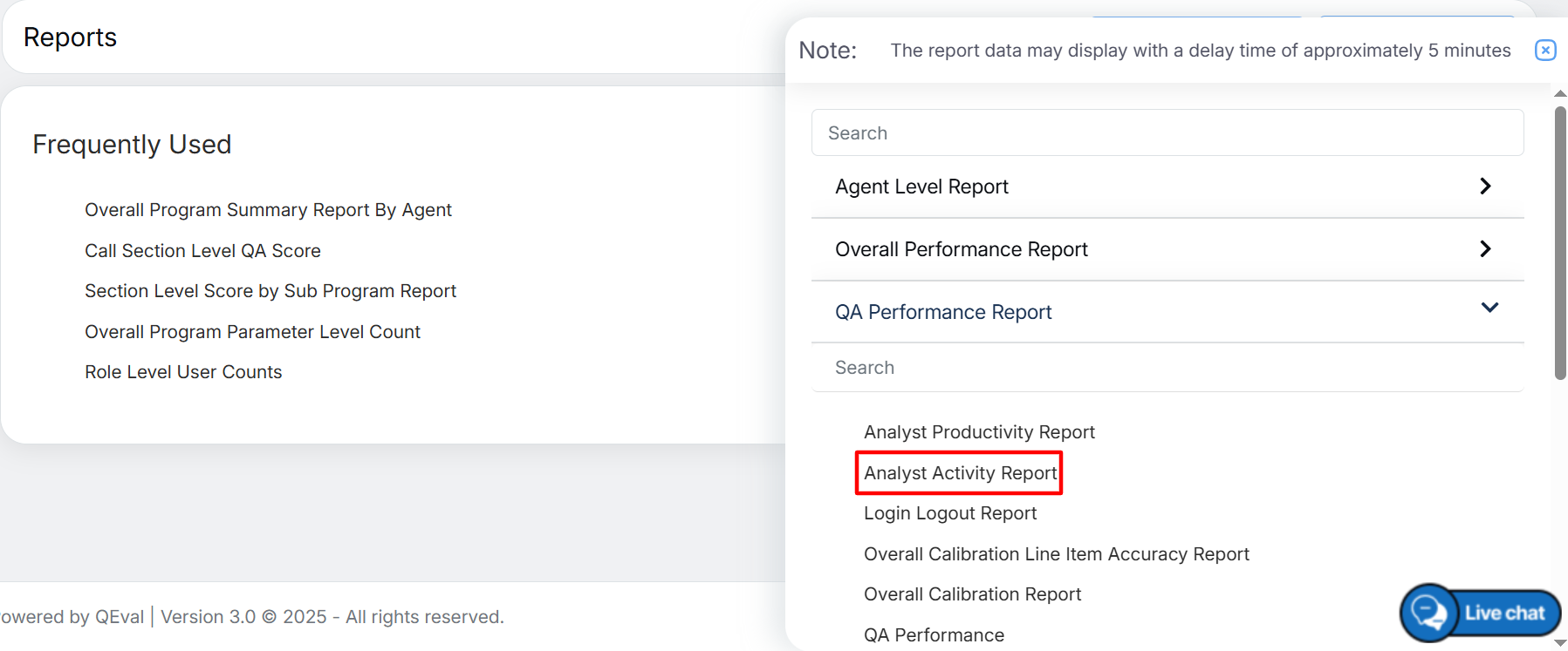 To view the report, select Reports > Report > QA Performance Report > Analyst Activity Report.