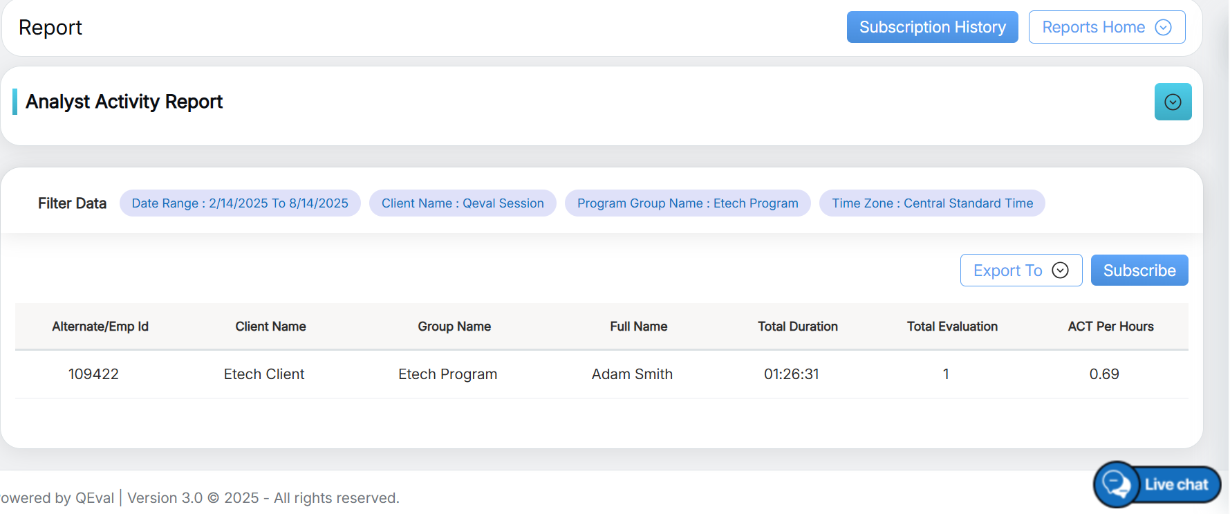 Analyst Activity Report displays the detailed data of individual analysts for a particular client and program group on a given date/time period.