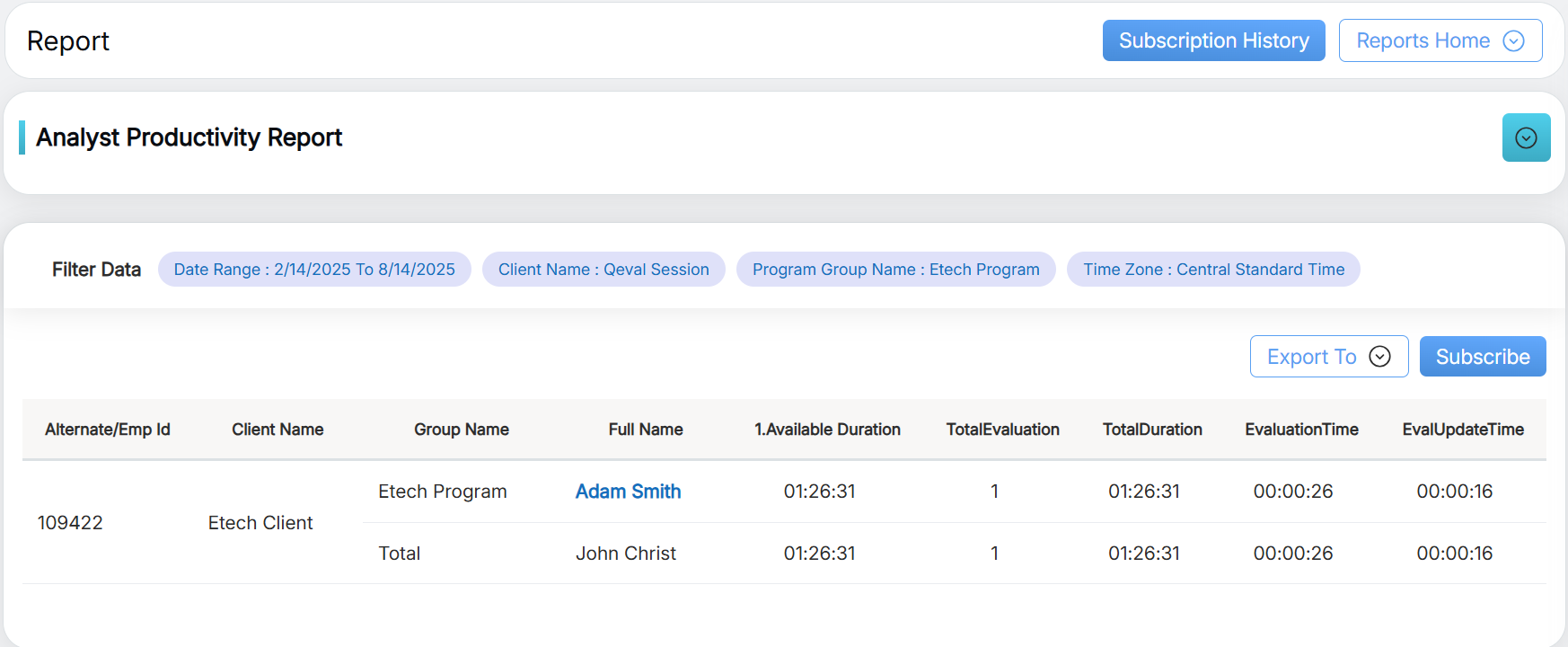 Analyst Productive Report displays the overall productive data of each analysts for a selected client and group name on a given date range.
