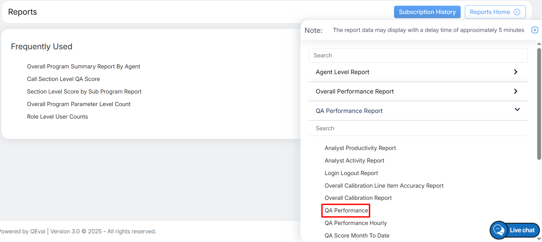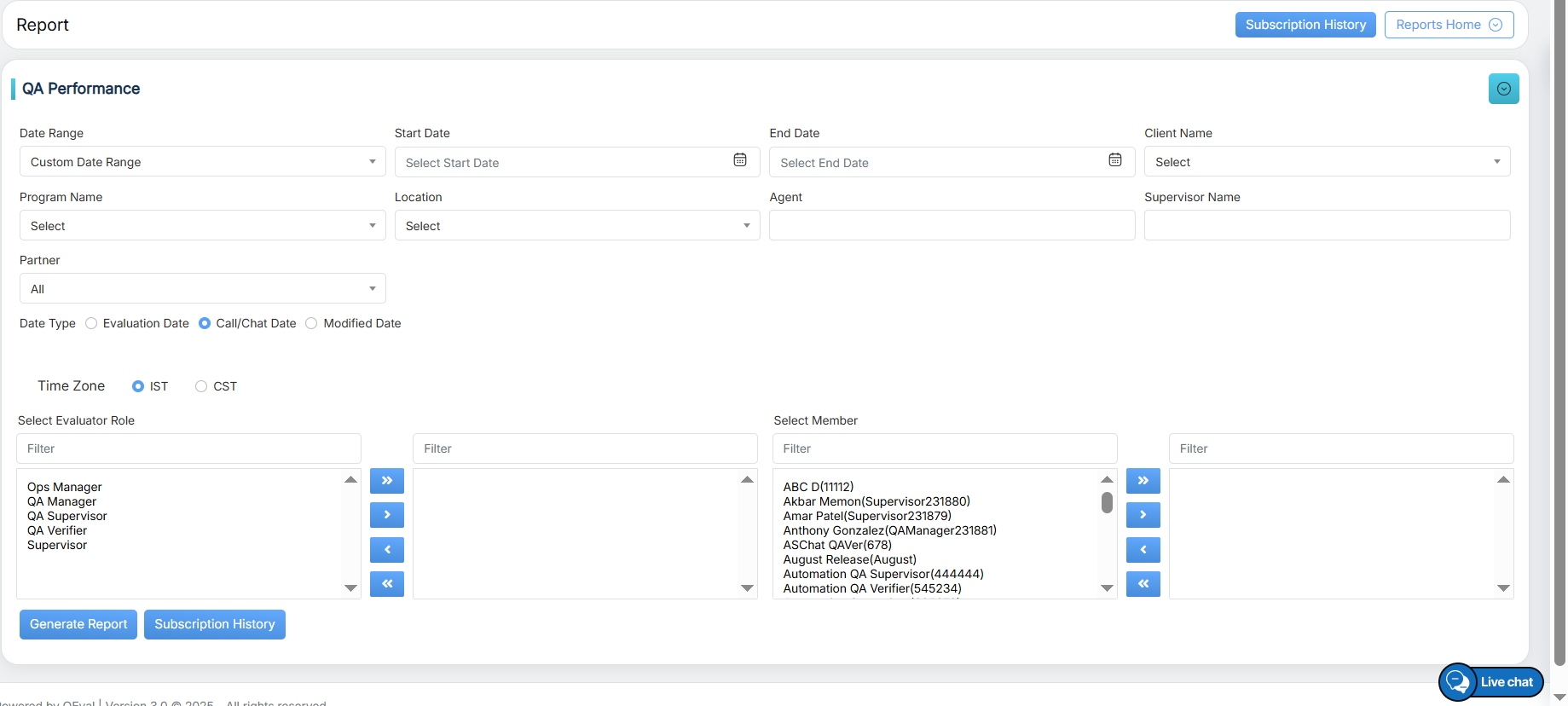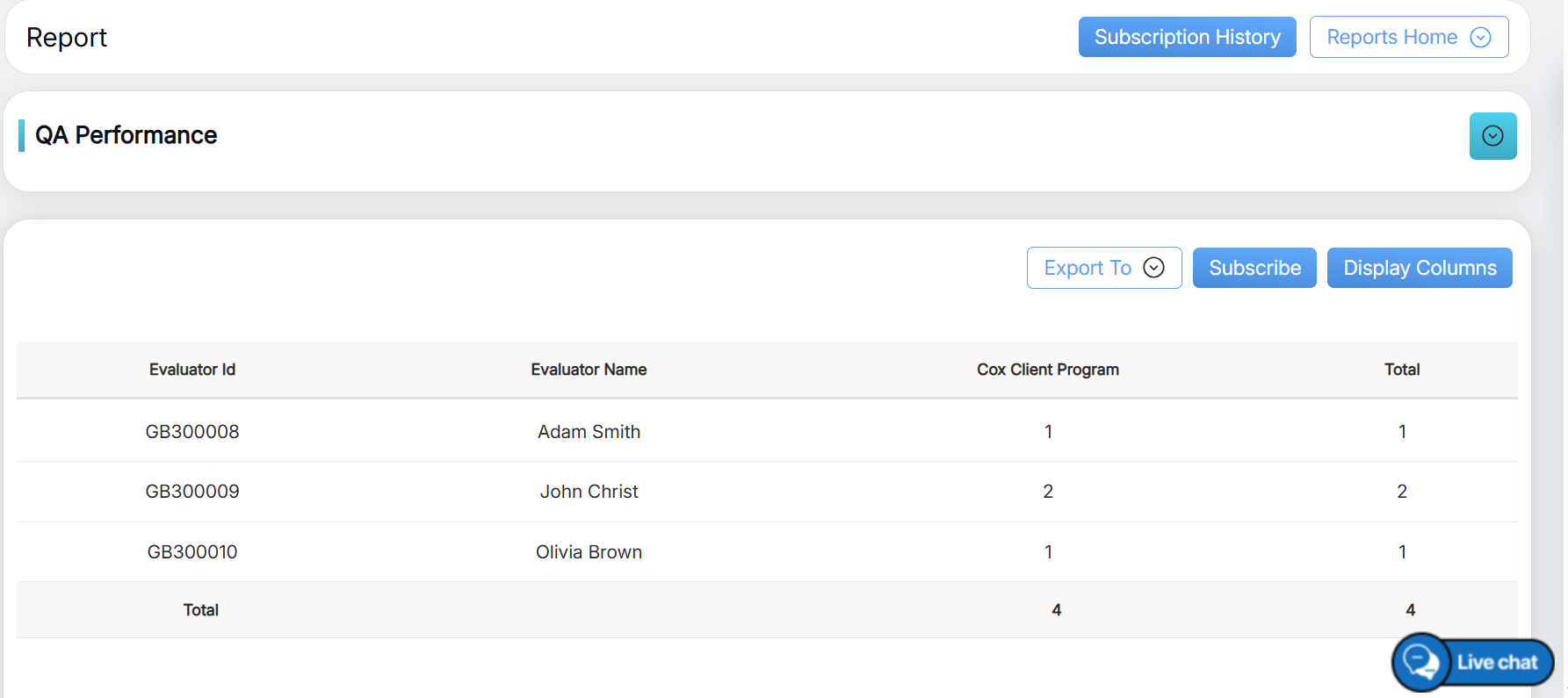 To view this report, select Reports > Report > QA Performance Report > QA Performance.