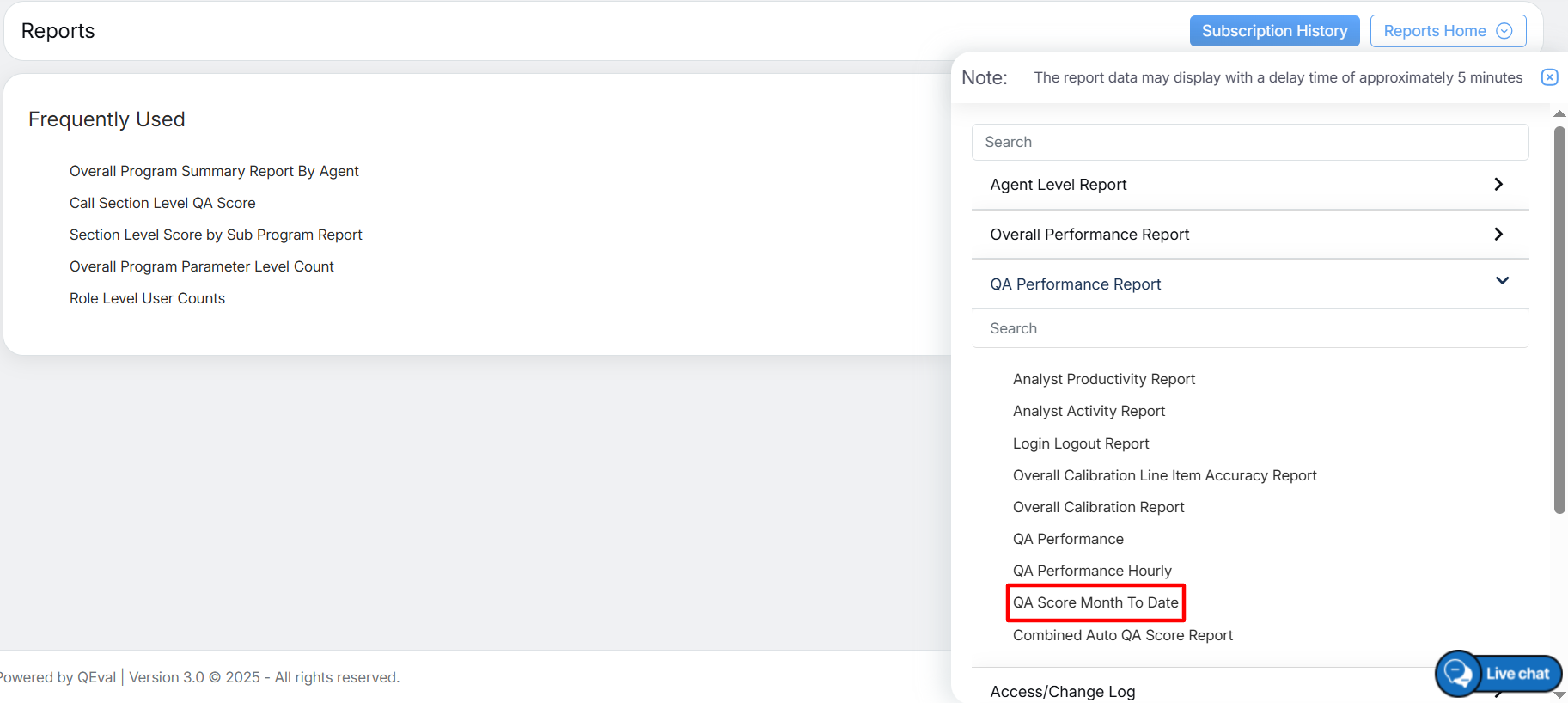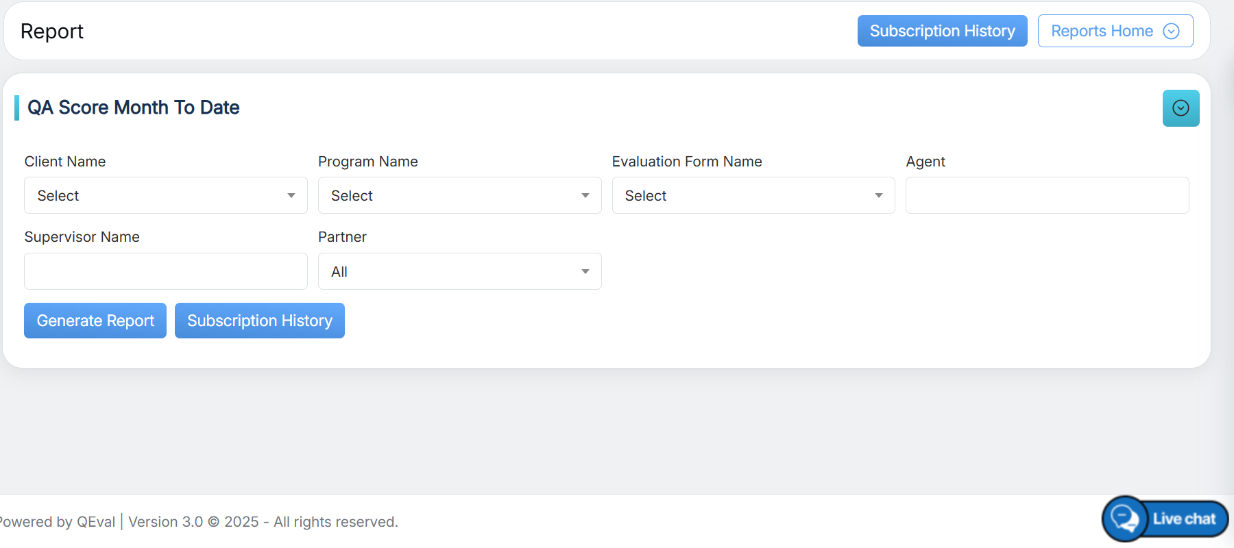 To view this report, select Reports > Report > QA Performance Report > QA Score Month to Date Report as shown below: