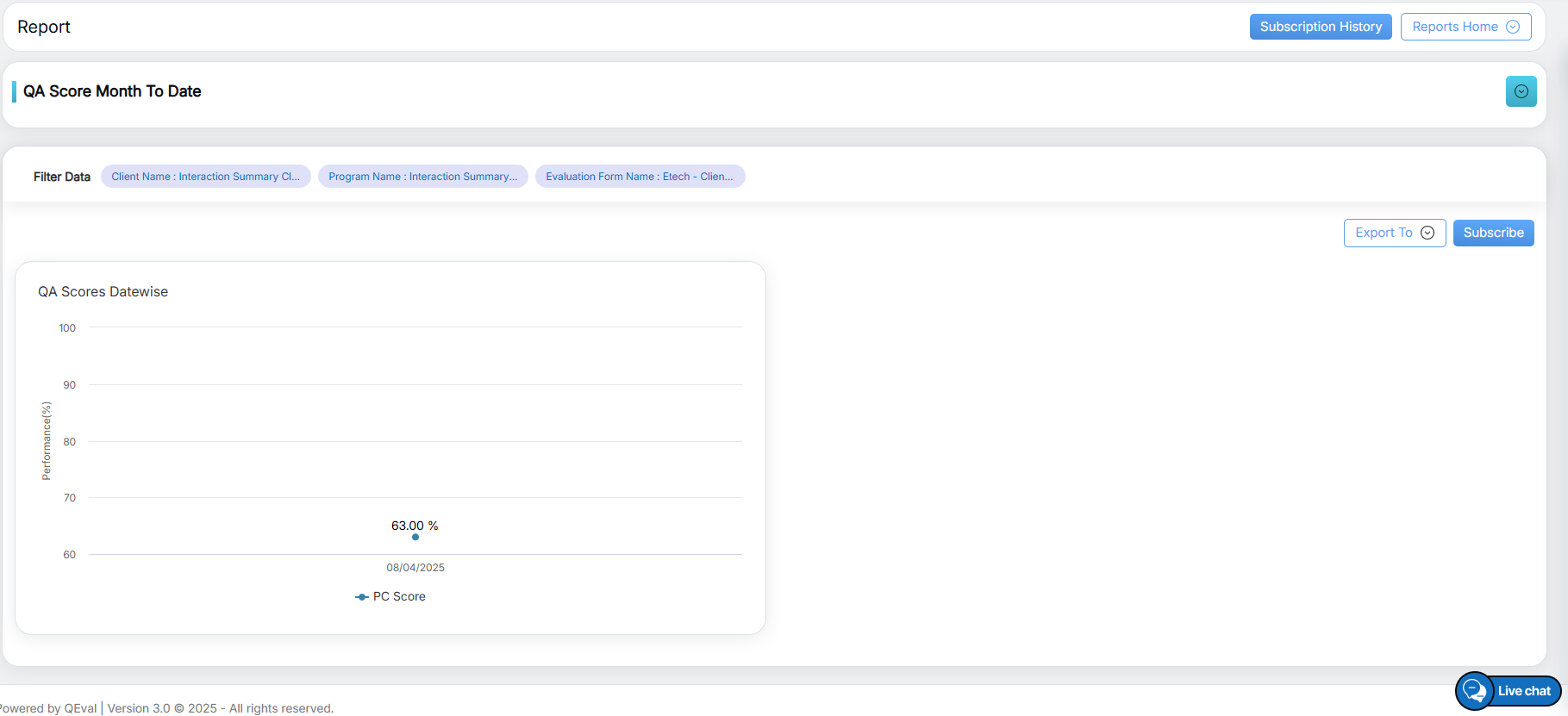 QA Score Month to Date Report displays QA score on each date and in percentage for the selected duration.