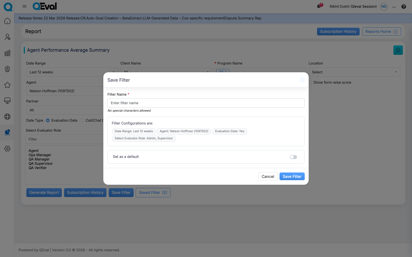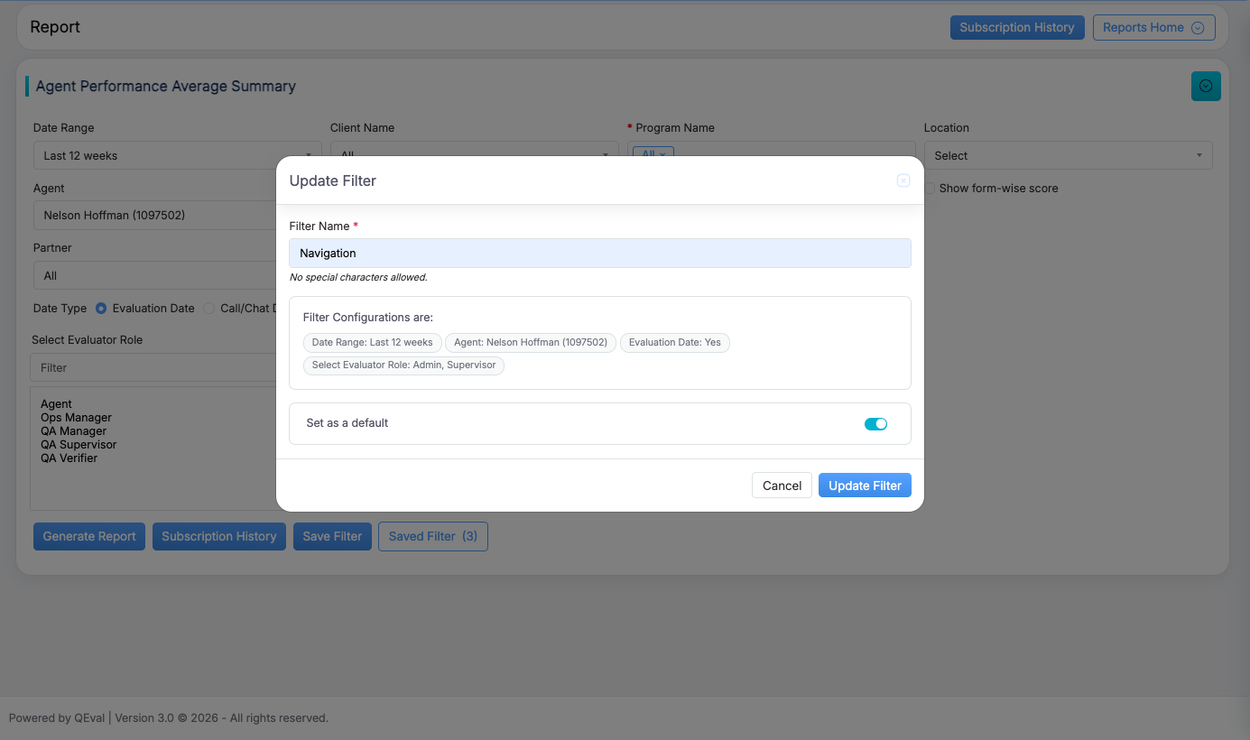 After making the required changes, click Save Filter to open the Update Filter pop-up, where you can revise the filter name, review the updated criteria, and optionally set it as the default filter.