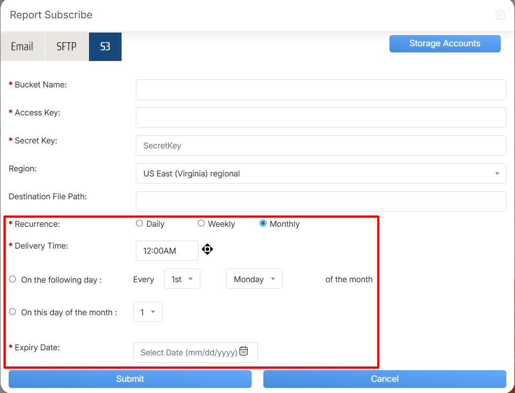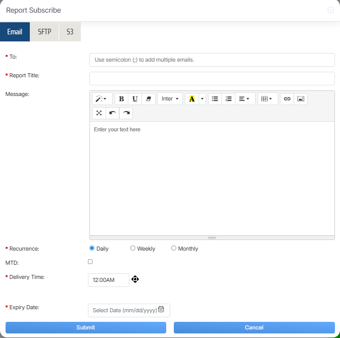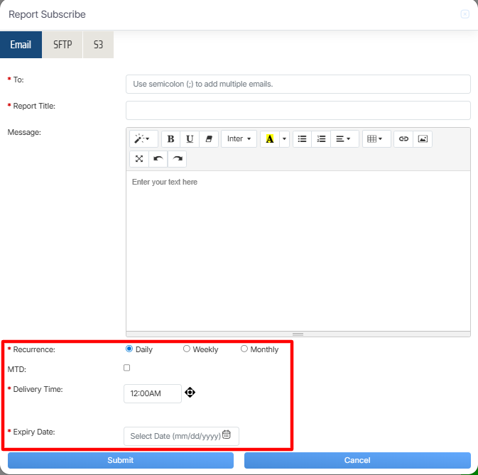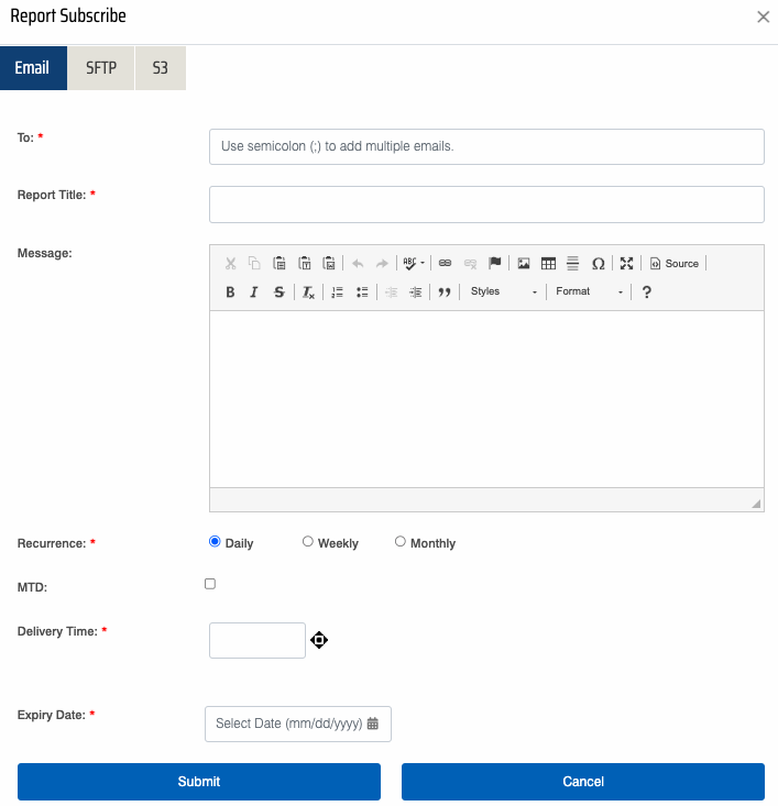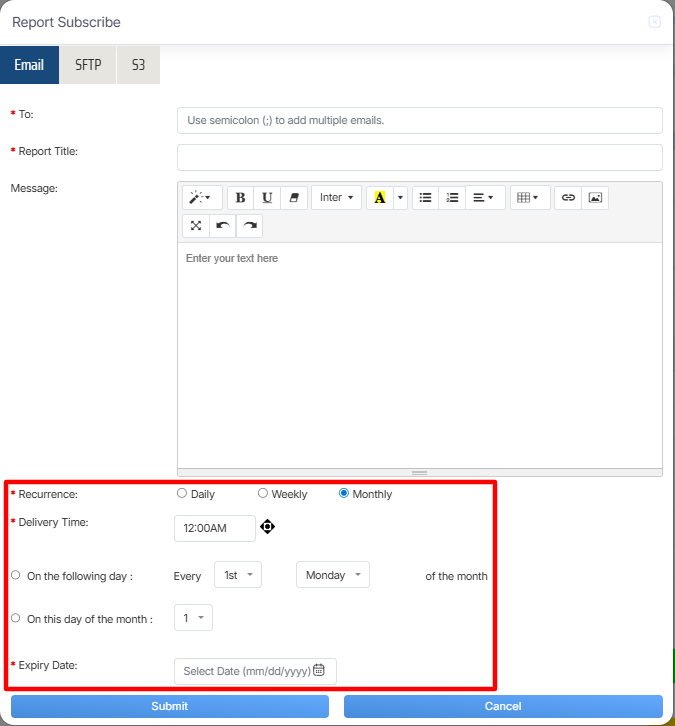 Once the necessary details are configured, click on the Submit button to subscribe the report or click on the Cancel button to discard the process.