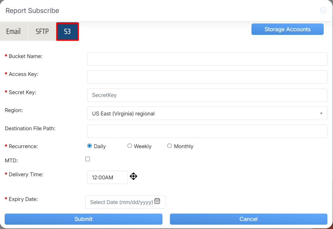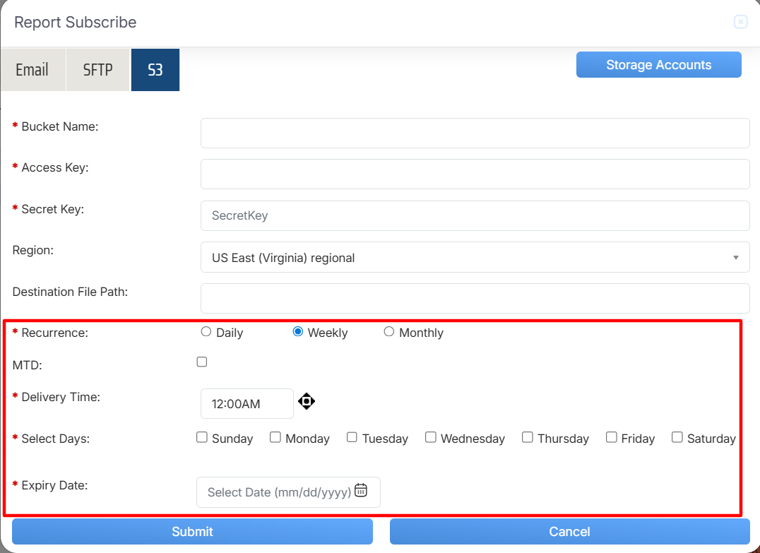 Now, click on “S3” button, from the window of Report Schedule as mentioned in below screenshot: