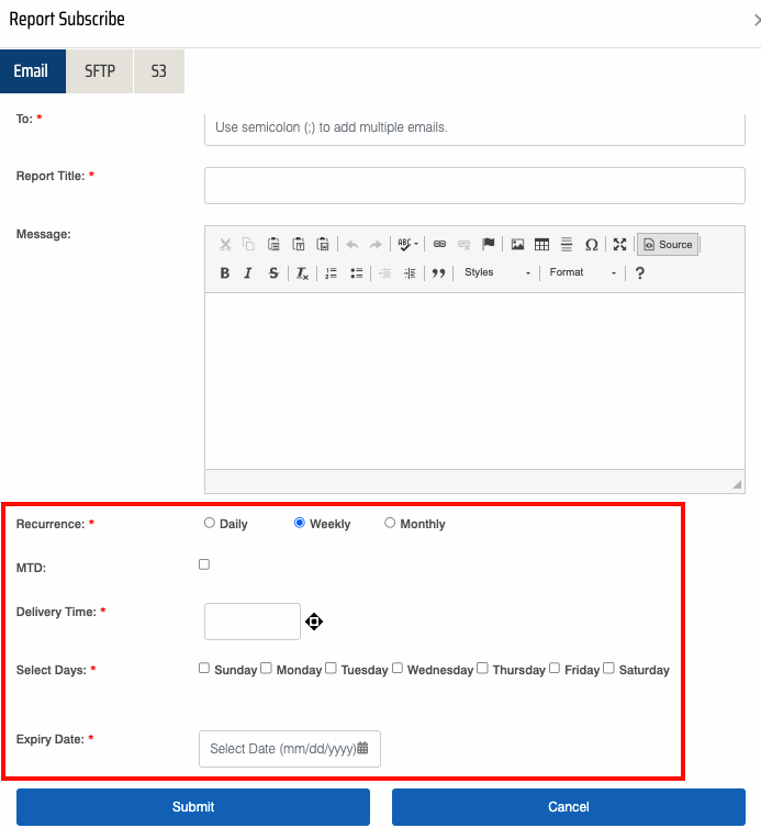 - Expiry Day: Select the expiry date on while the report scheduling will stop.