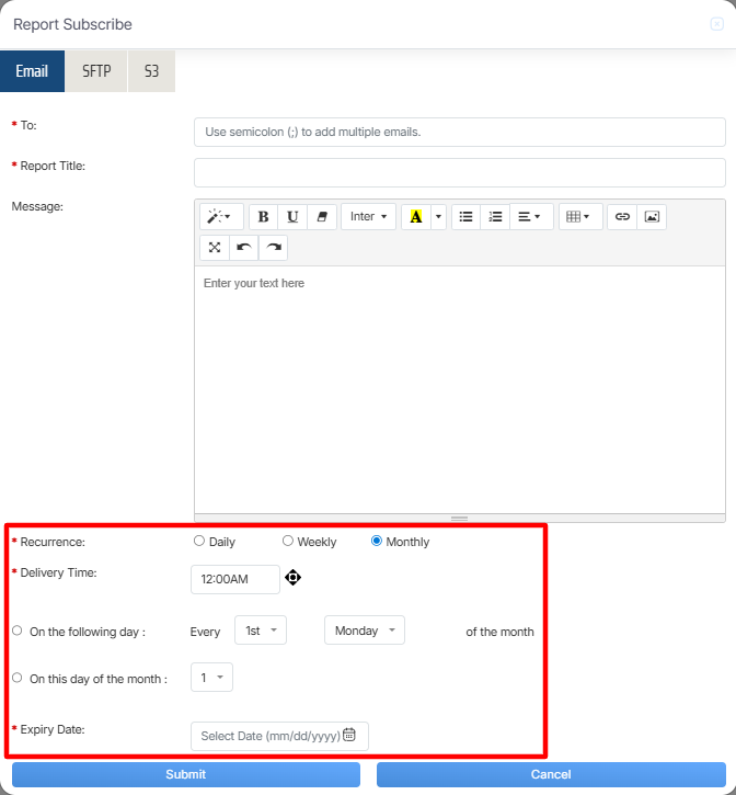 Once the necessary details are configured, click on the Submit button to subscribe the report or click on the Cancel button to discard the process.