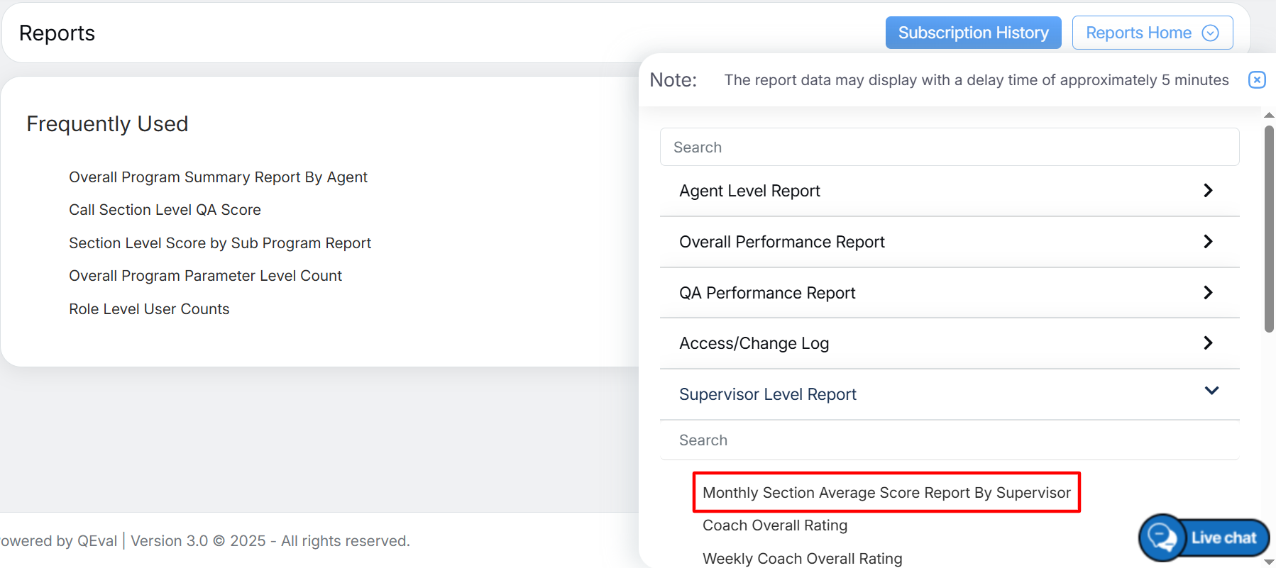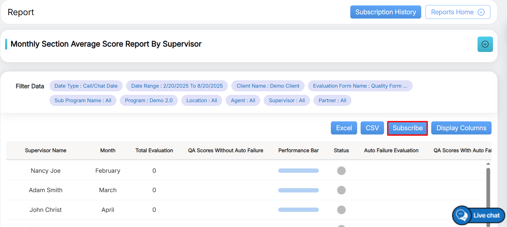 To view this report, select Reports > Report > Supervisor Level Report > Monthly Section Average Score Report By Supervisor.