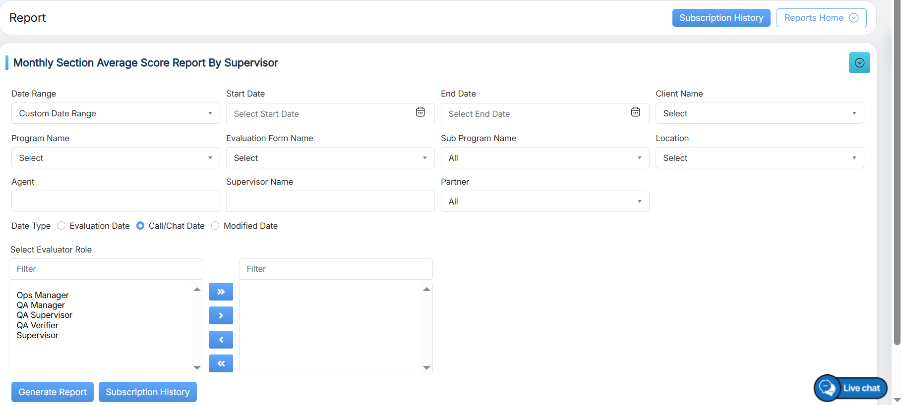 Evaluation Date: Select the radio button to search on the basis of the Evaluation date. Call/Chat Date: Select the radio button to search on the basis of the call/chat date. Modified Date: Select the radio button to search on the basis of the evaluation form modified date. |