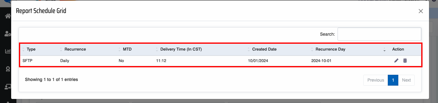 Upon clicking on the Subscription History button, the following Report Schedule Grid pop-up window will be displayed-