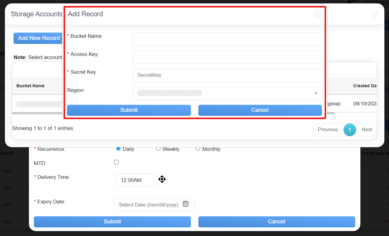 Provide the necessary information in the appropriate fields and click the Submit button to save and store the new record in the storage account.