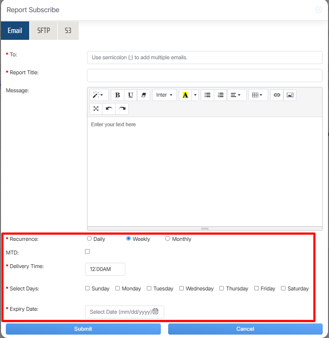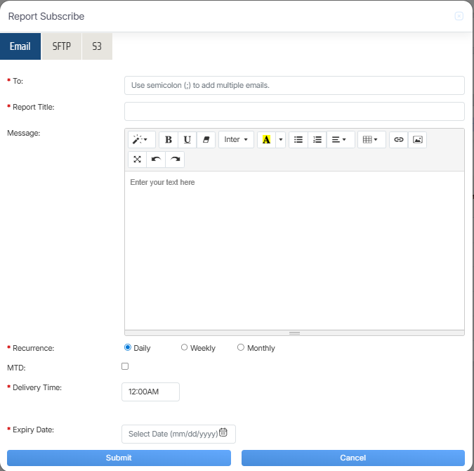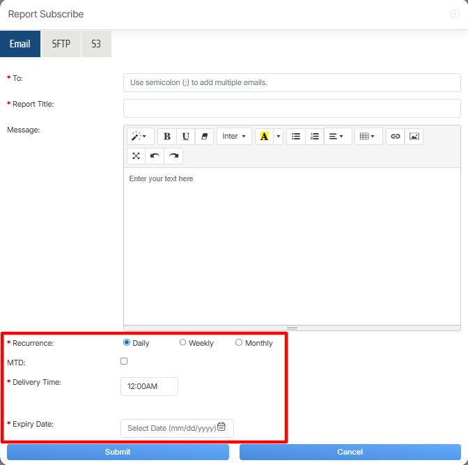 Once the necessary details are configured, click on the Submit button to subscribe the report or click on the Cancel button to discard the process.
