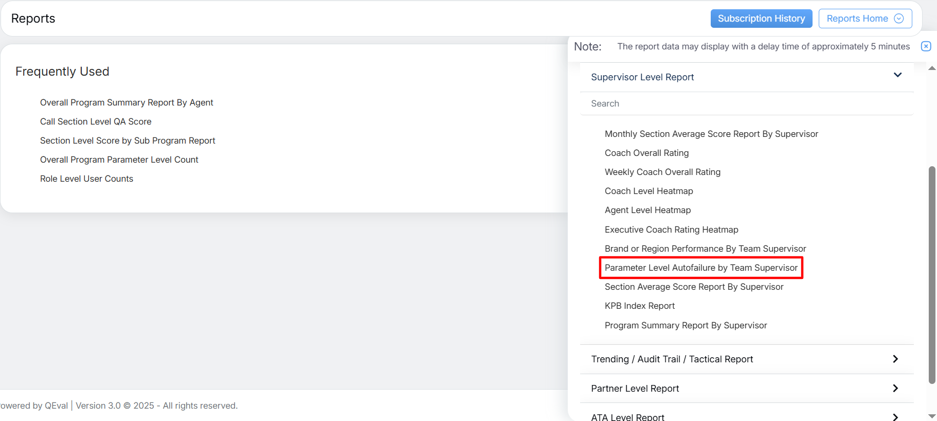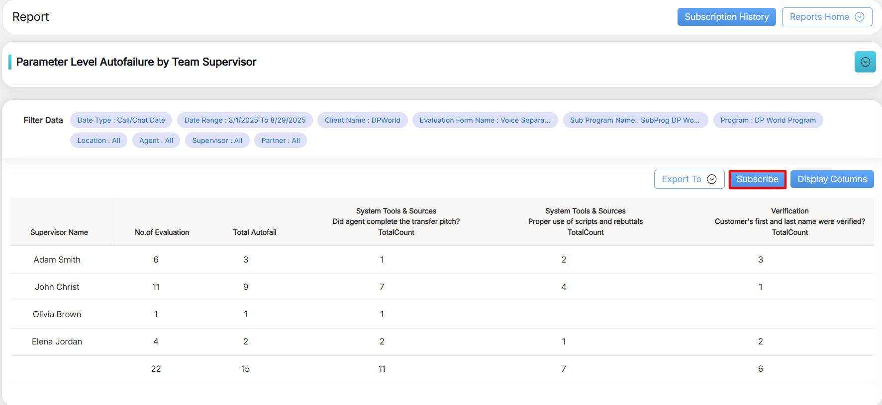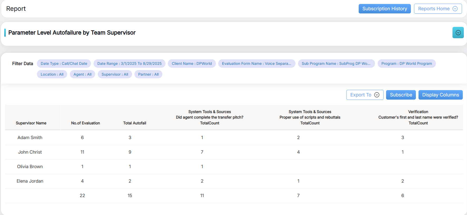 To view this report, select Reports > Report > Supervisor Level Report > Parameter Level Autofailure By Team Supervisor.