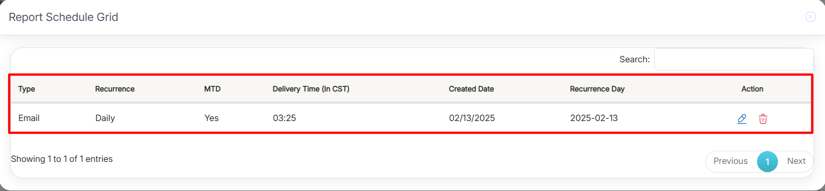 Upon clicking on the Subscription History button, the following Report Schedule Grid pop-up window will be displayed-