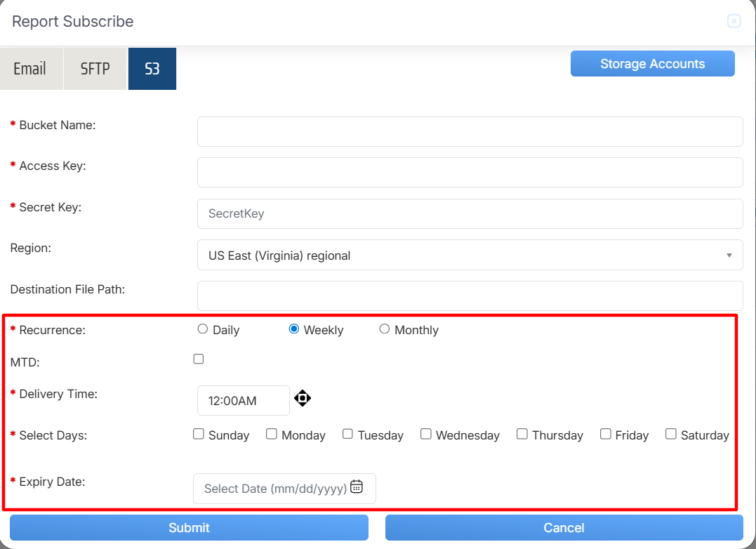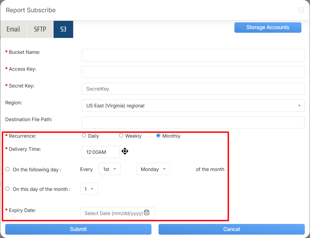 Now, click on “S3” button, from the window of Report Schedule as mentioned in below screenshot: