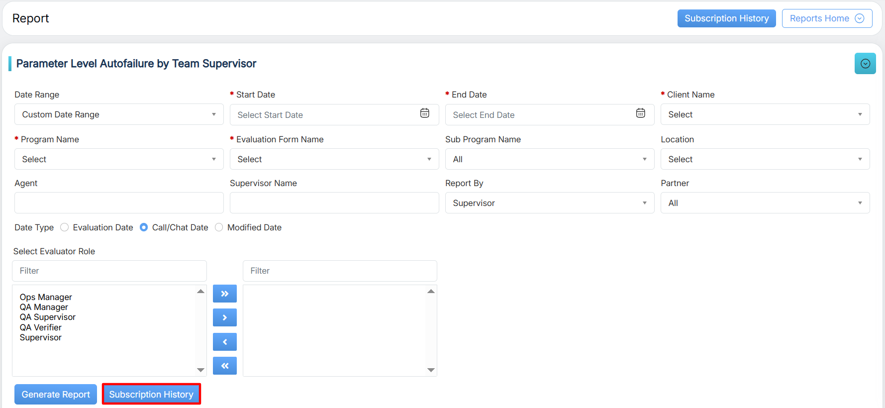 Evaluation Date: Select the radio button to search on the basis of the Evaluation date. Call/Chat Date: Select the radio button to search on the basis of the call/chat date. Modified Date: Select the radio button to search on the basis of the evaluation form modified date. |