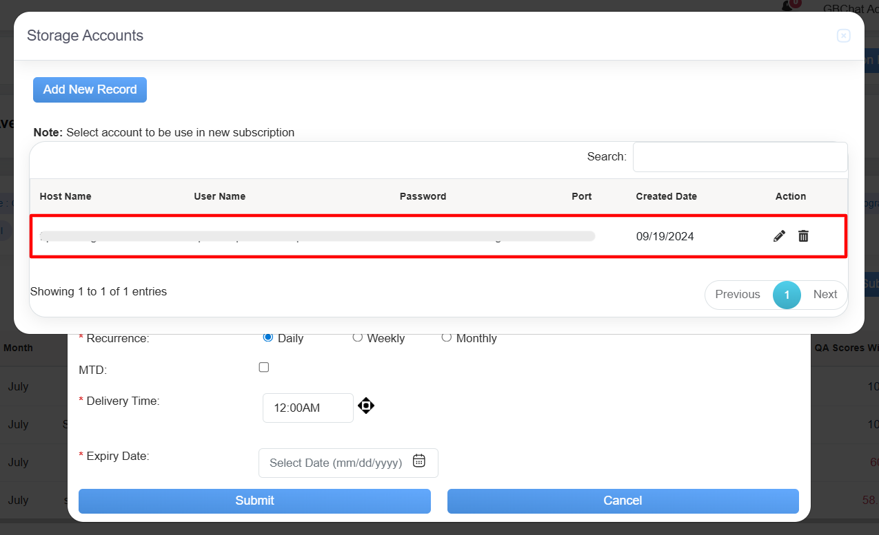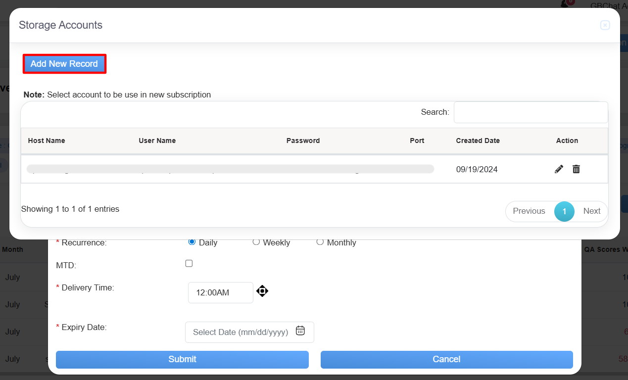 The Storage Account serves as a centralized repository for securely storing and managing evaluation-related data. It includes key details such as Host Name, User Name, Password, Port, Created Date, and Action, and provides users with the ability to add and maintain records. This system ensures that all evaluation data is organized, easily accessible, and securely stored for efficient reference and processing in the future.
