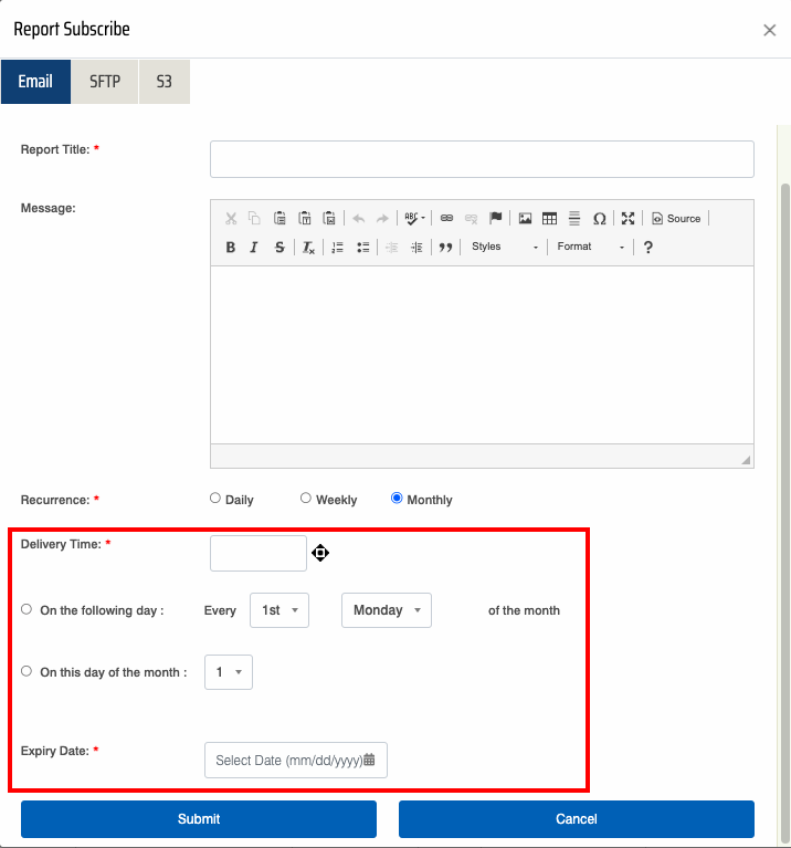 Once the necessary details are configured, click on the Submit button to subscribe the report or click on the Cancel button to discard the process.