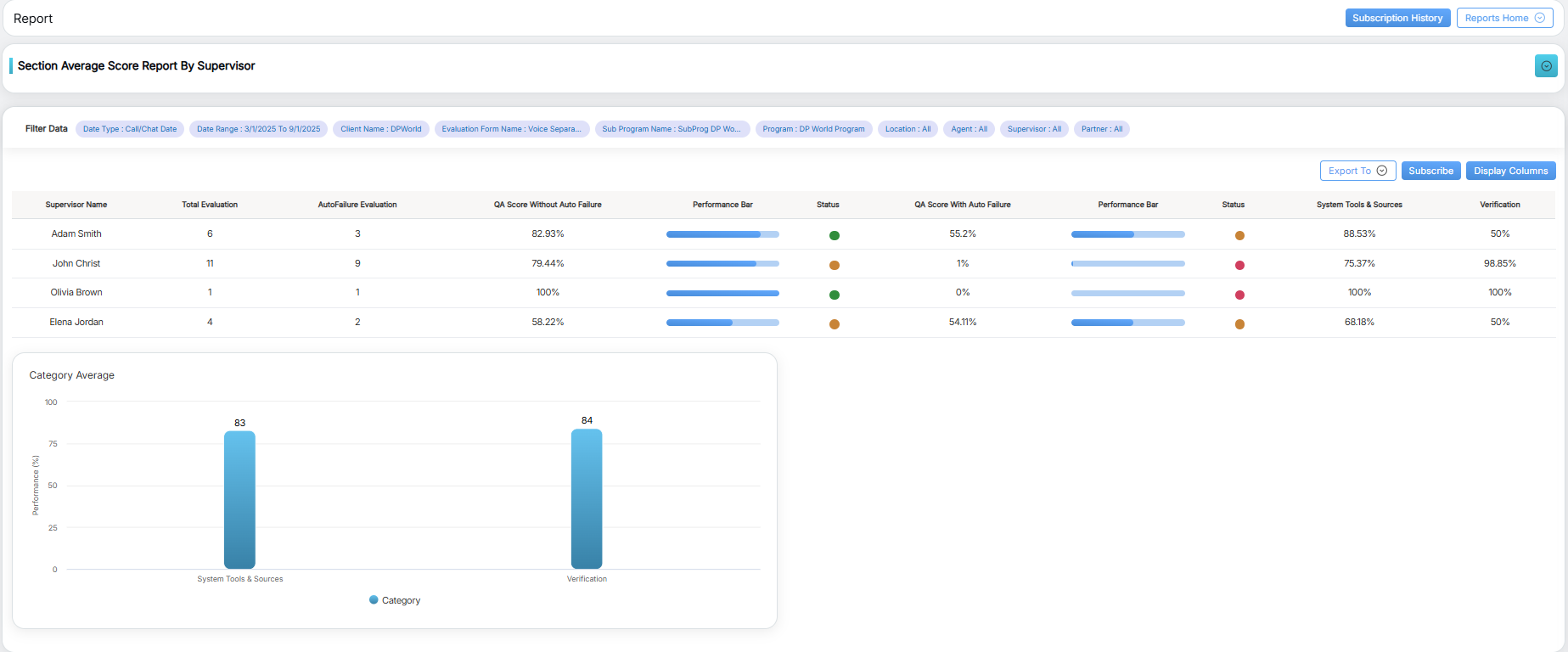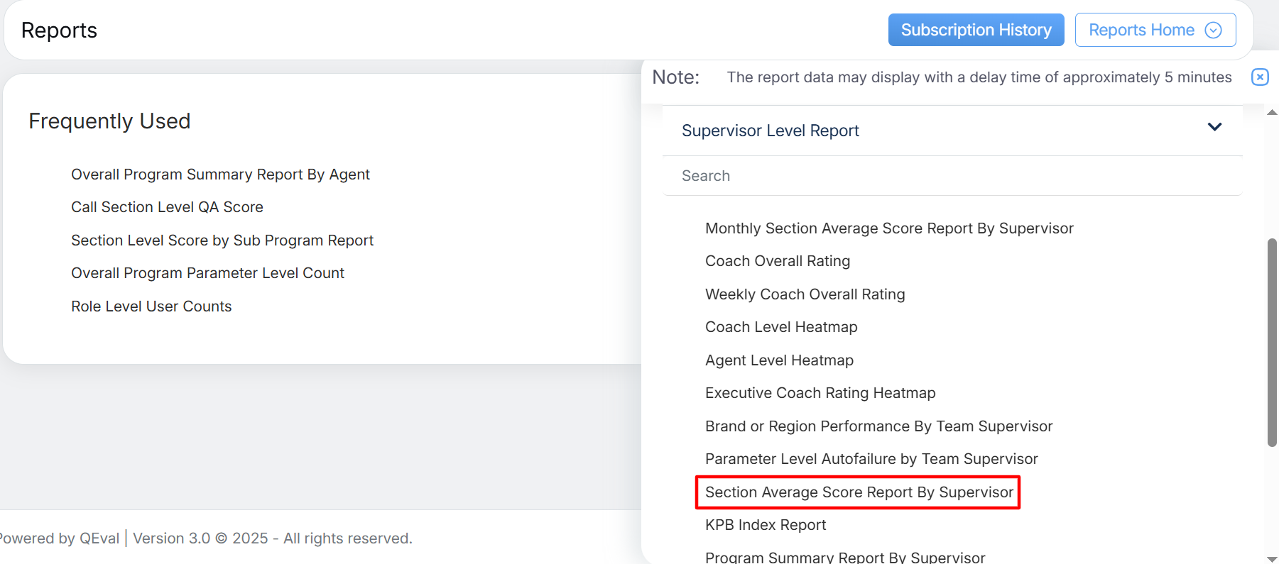 Section Average Score Report By Supervisor displays the section average score for a selected evaluation form for a given period by the supervisor.