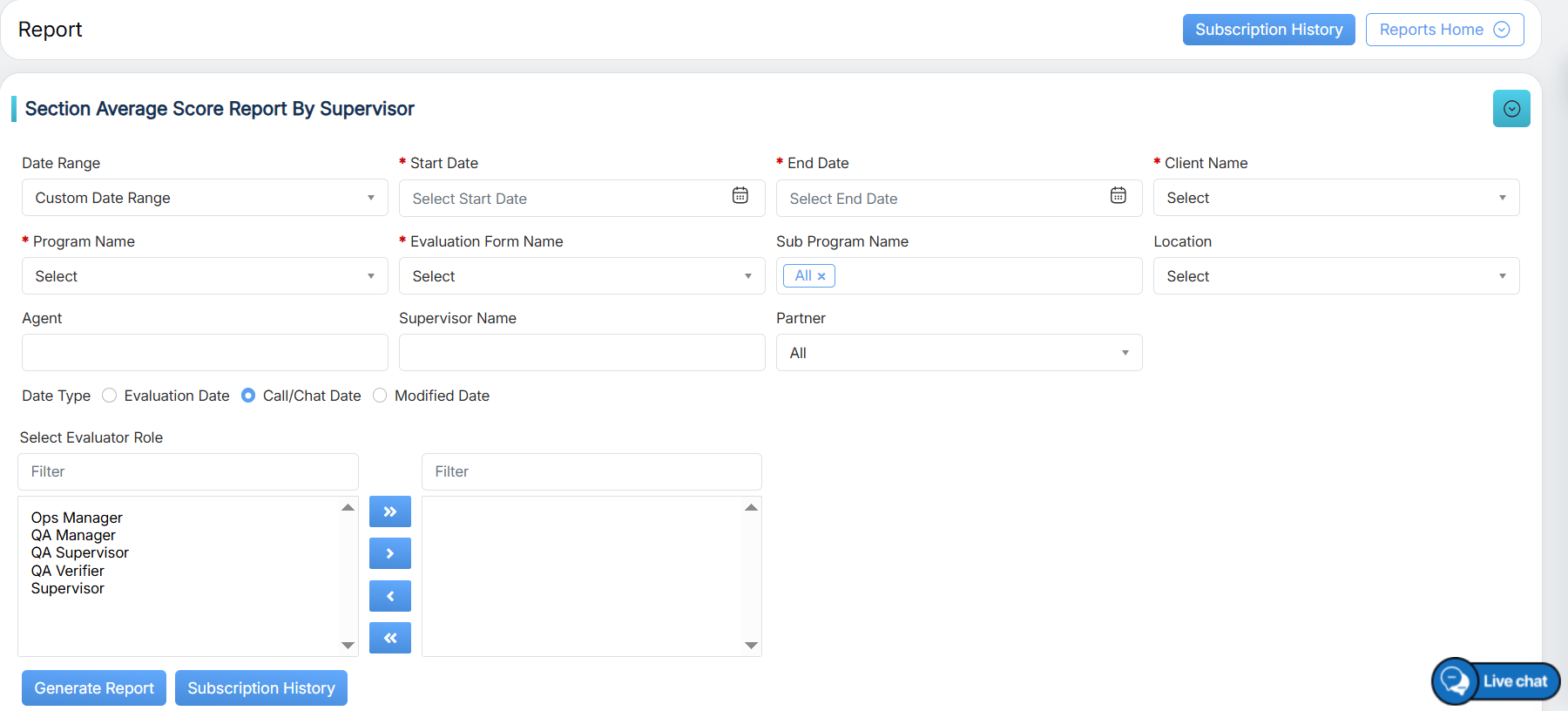 Evaluation Date: Select the radio button to search on the basis of the Evaluation date. Call/Chat Date: Select the radio button to search on the basis of the call/chat date. Modified Date: Select the radio button to search on the basis of the evaluation form modified date. |