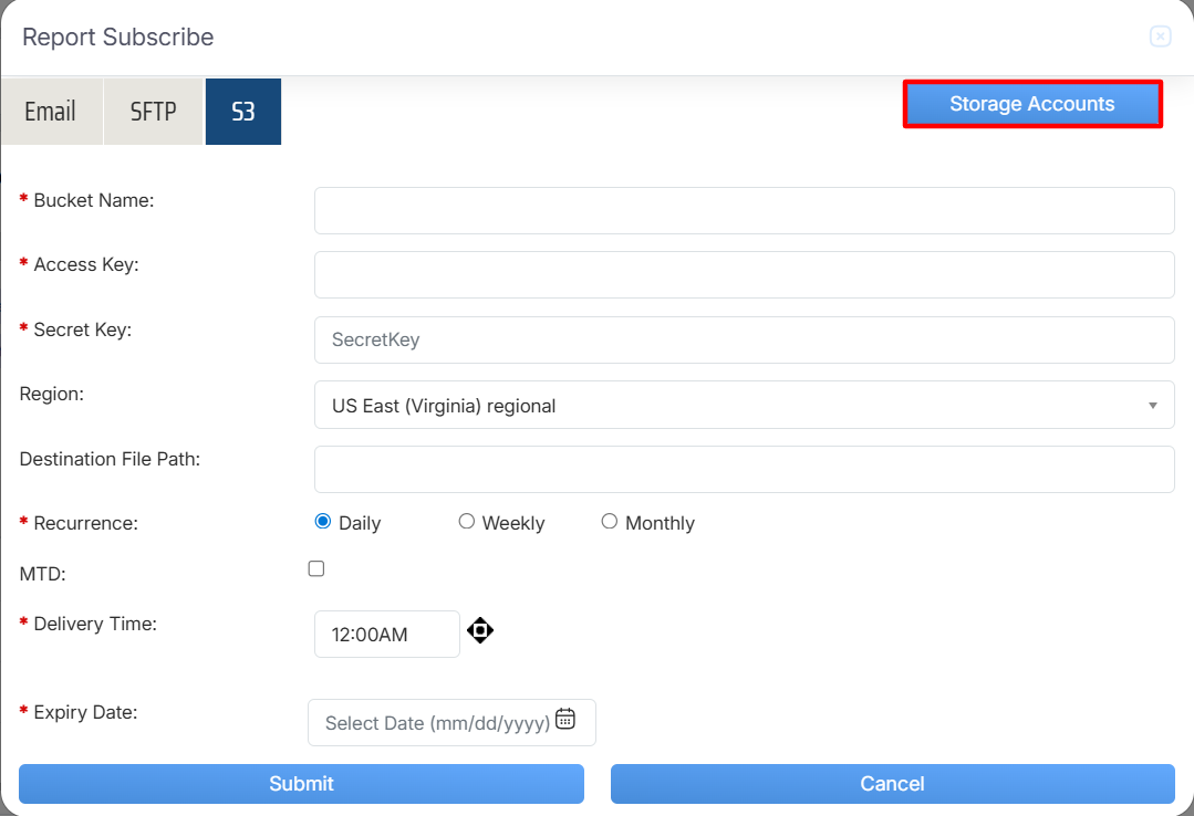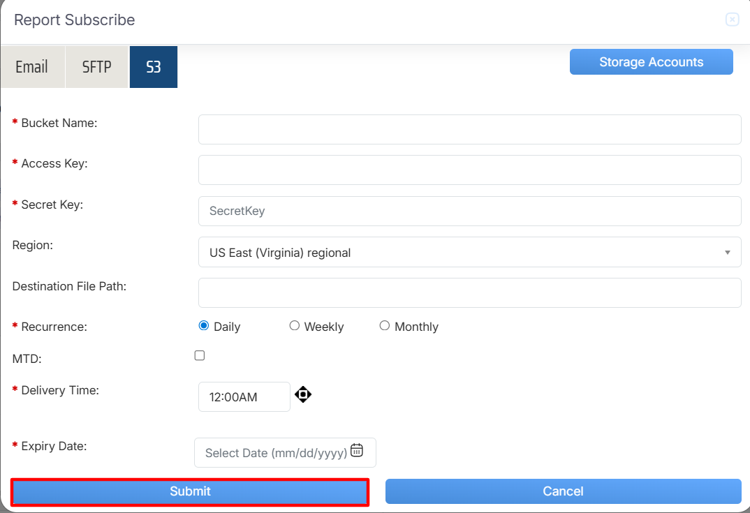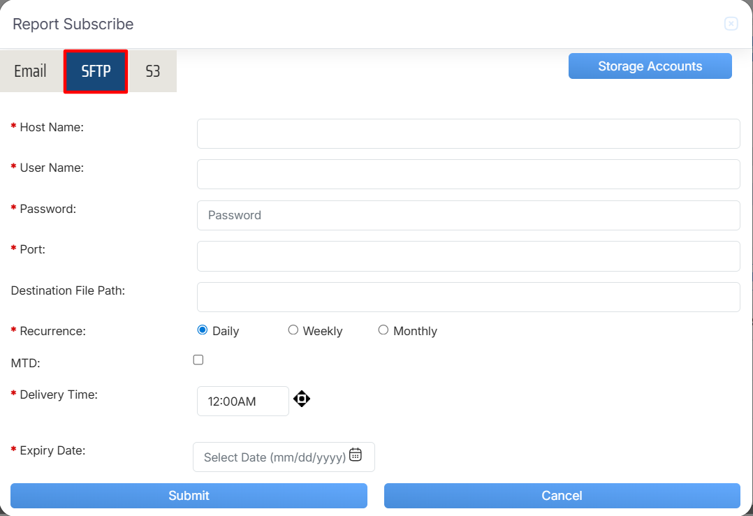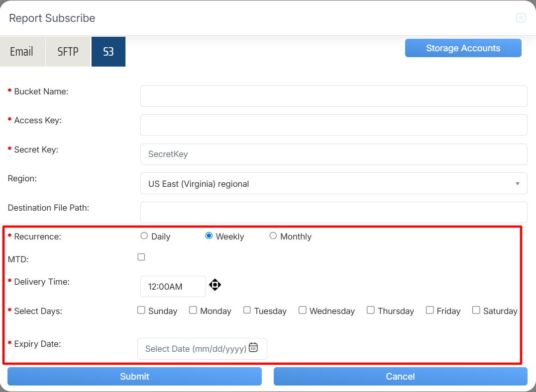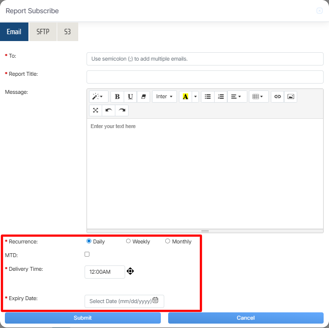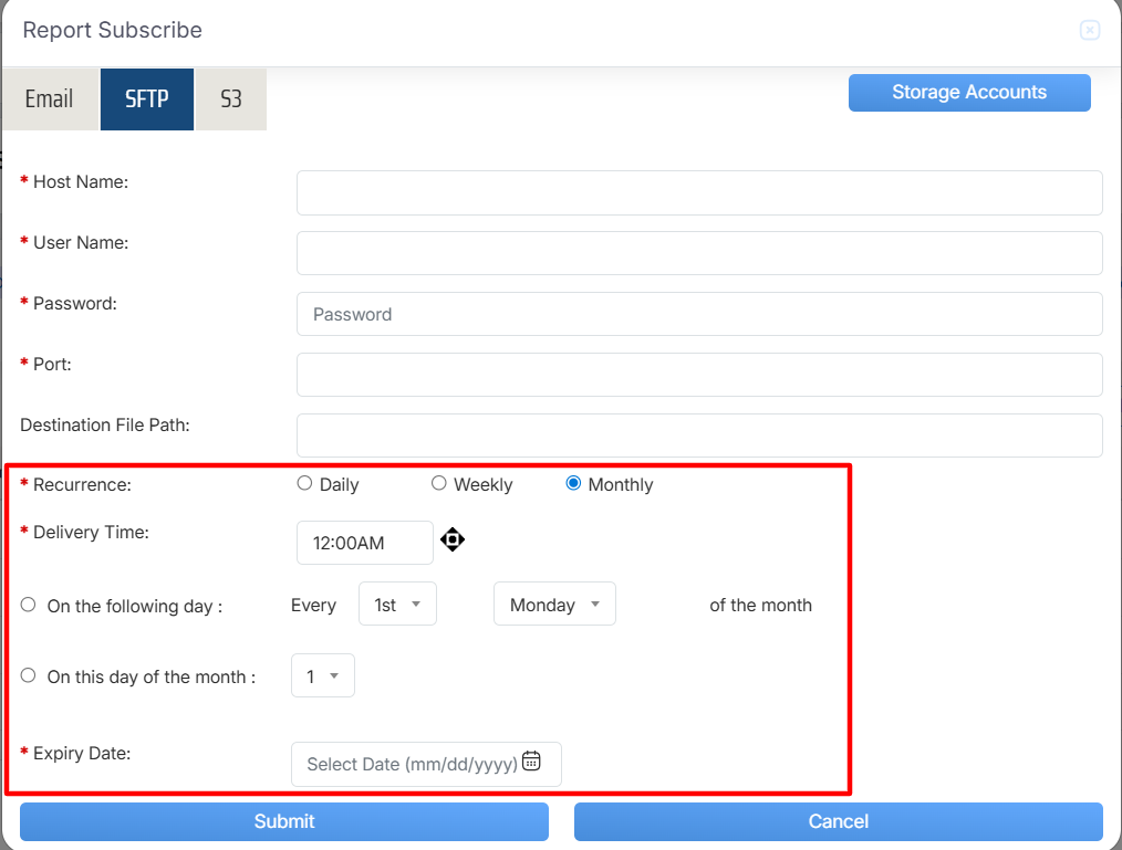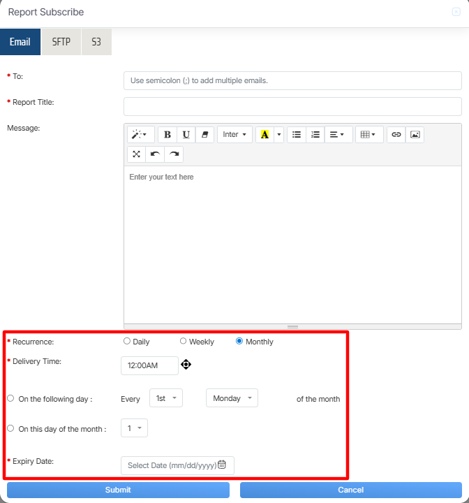 Once the necessary details are configured, click on the Submit button to subscribe the report or click on the Cancel button to discard the process.