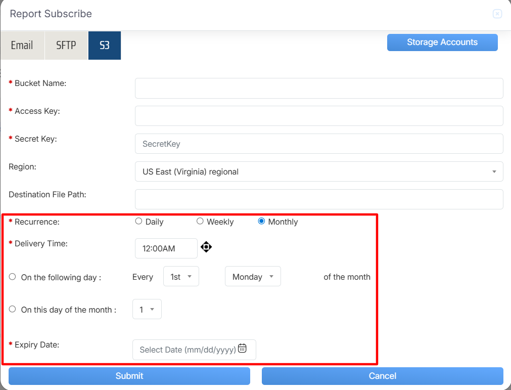 Now, click on “S3” button, from the window of Report Schedule as mentioned in below screenshot: