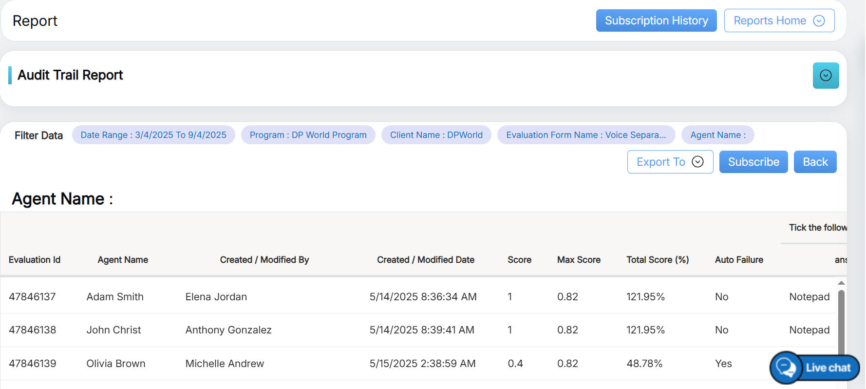 Audit Trail Report displays the changes done in an already submitted evaluation form.