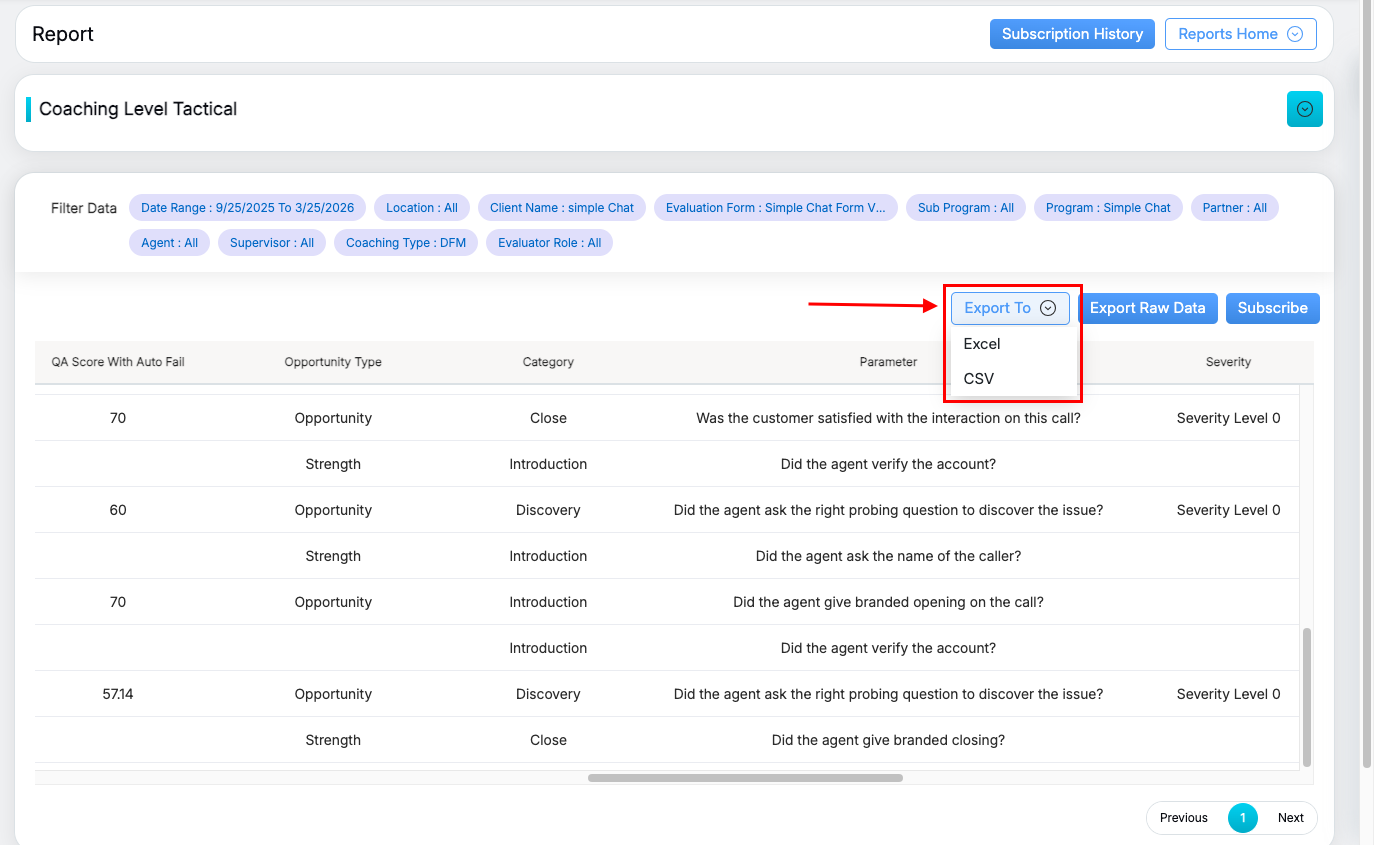 Click on the Export Raw Data button to export the complete dataset as an Excel sheet without any blank spaces, displaying all available data in a structured format as highlighted in the screen below-
