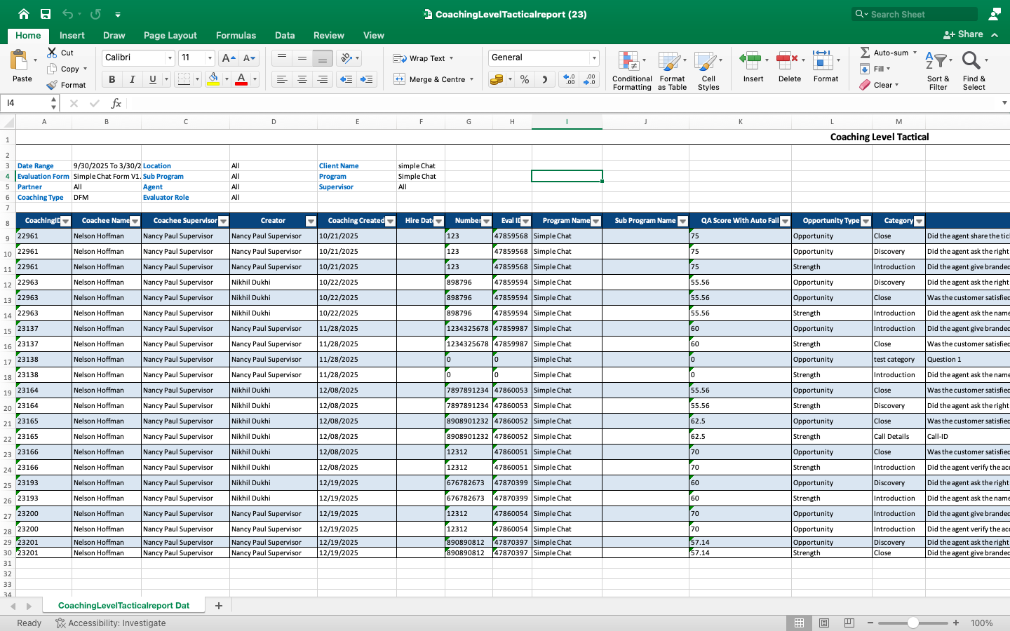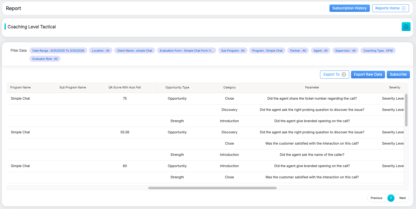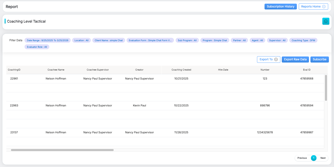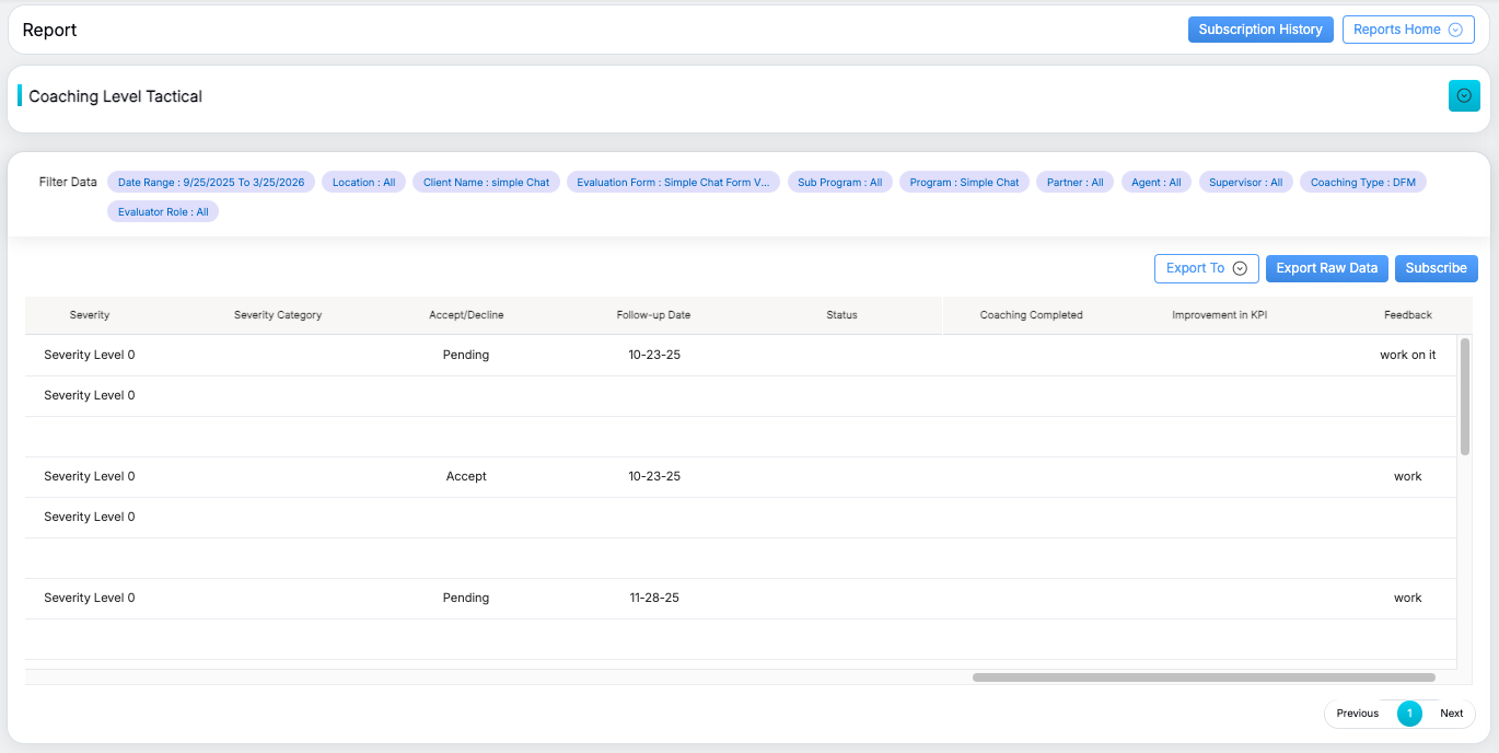Coaching Level Tactical displays data on the coaching session’s details for each agent.
