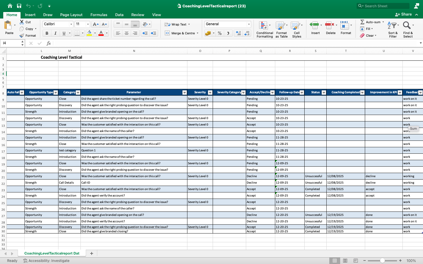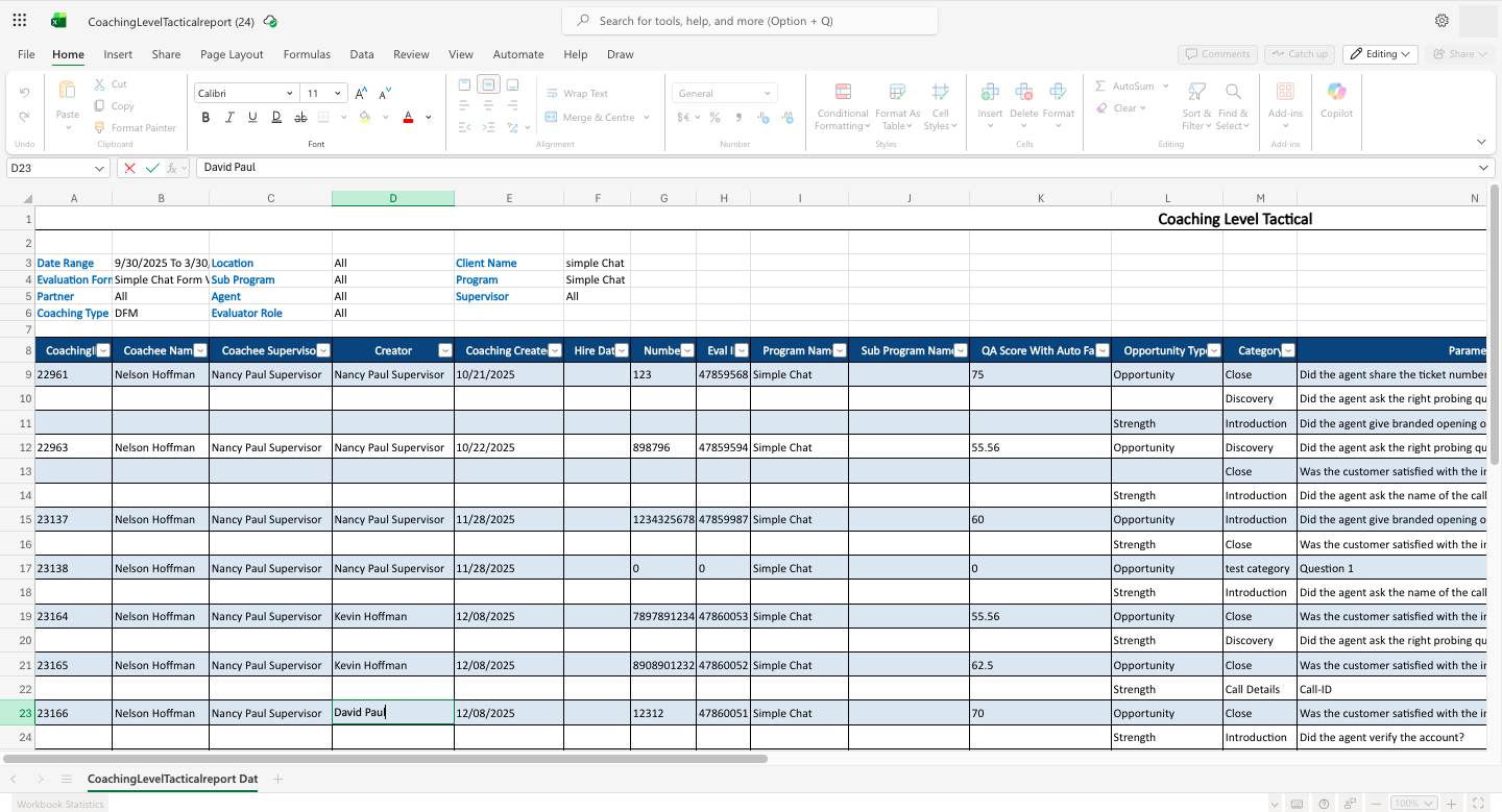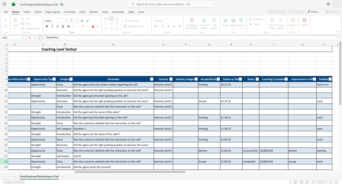 Coaching Level Tactical displays data on the coaching session’s details for each agent.