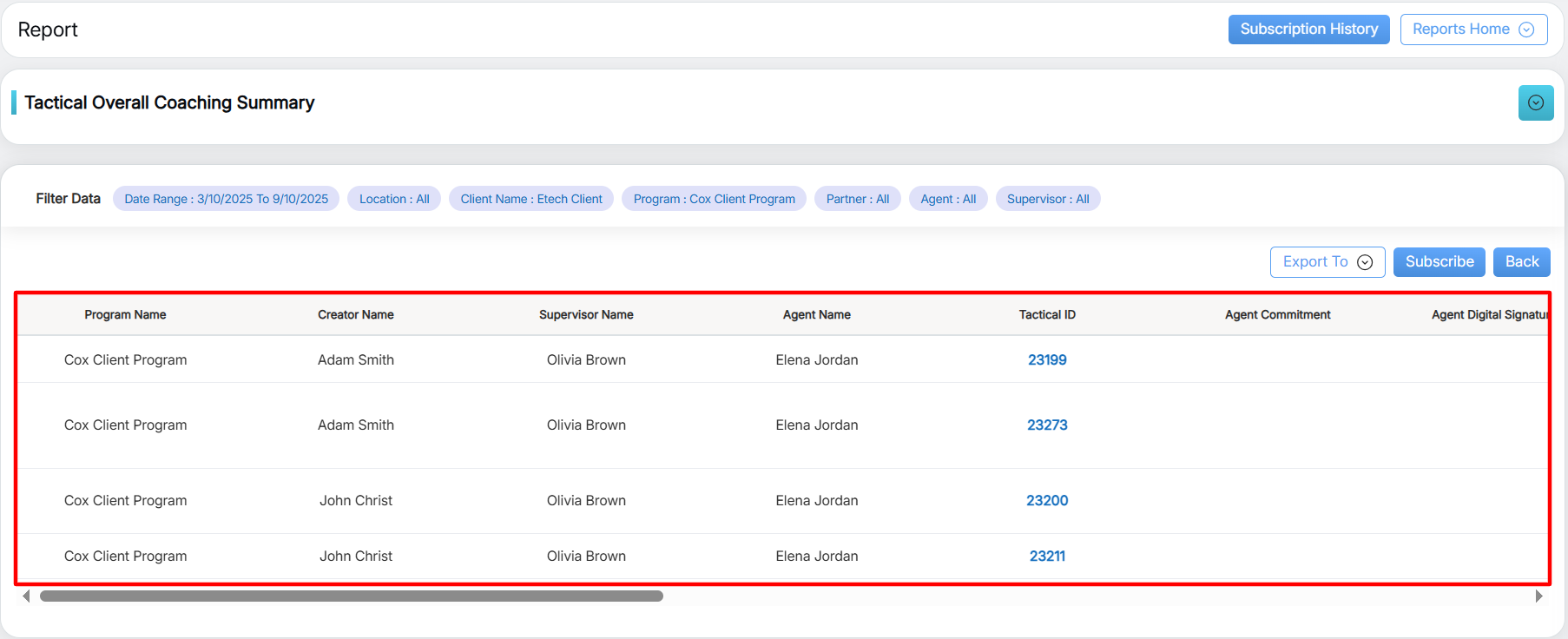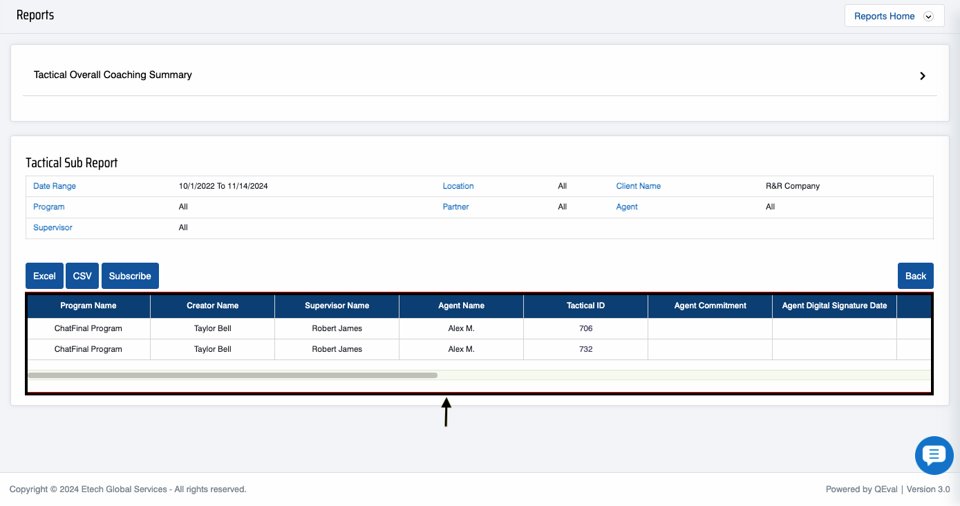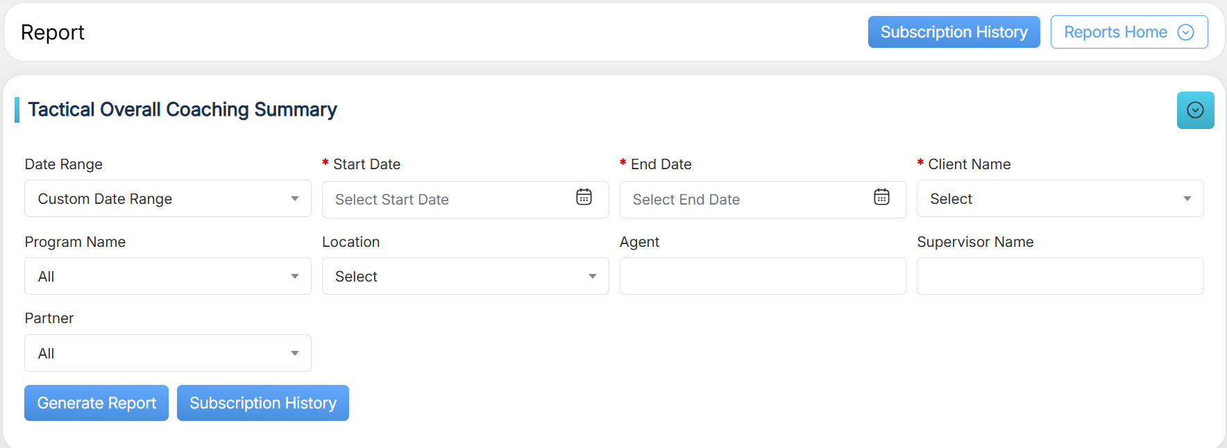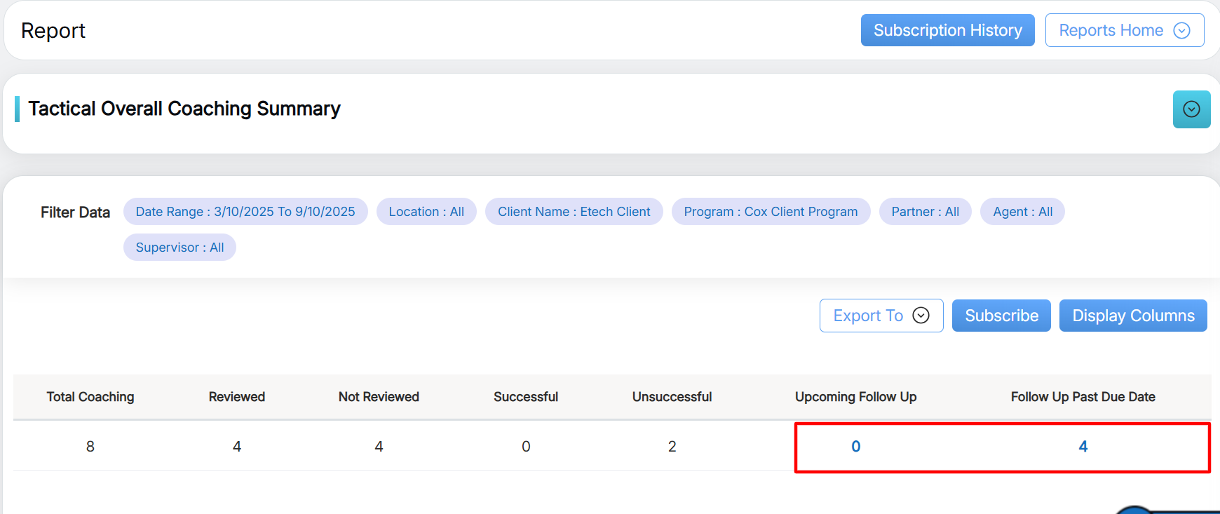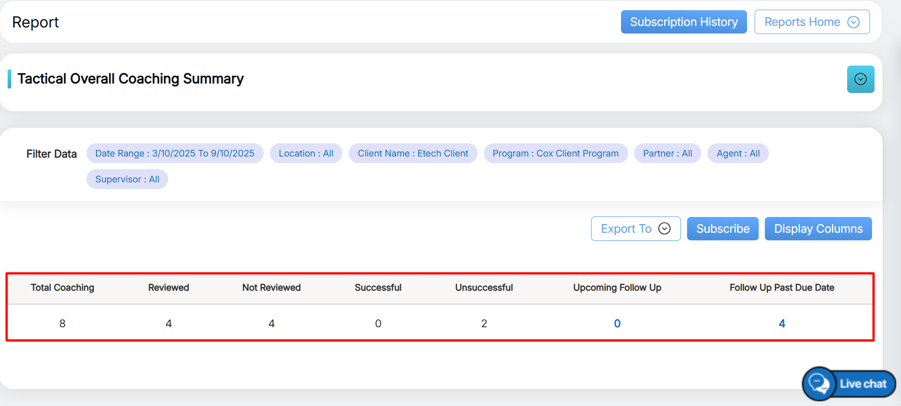 To view this report, select Reports > Report > Trending/Audit Trail /Tactical Report > Tactical Overall Coaching Summary: