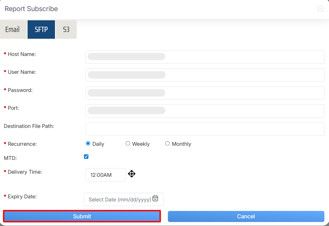 Now, click on “SFTP” button, from the window of Report Schedule as mentioned in below screenshot: