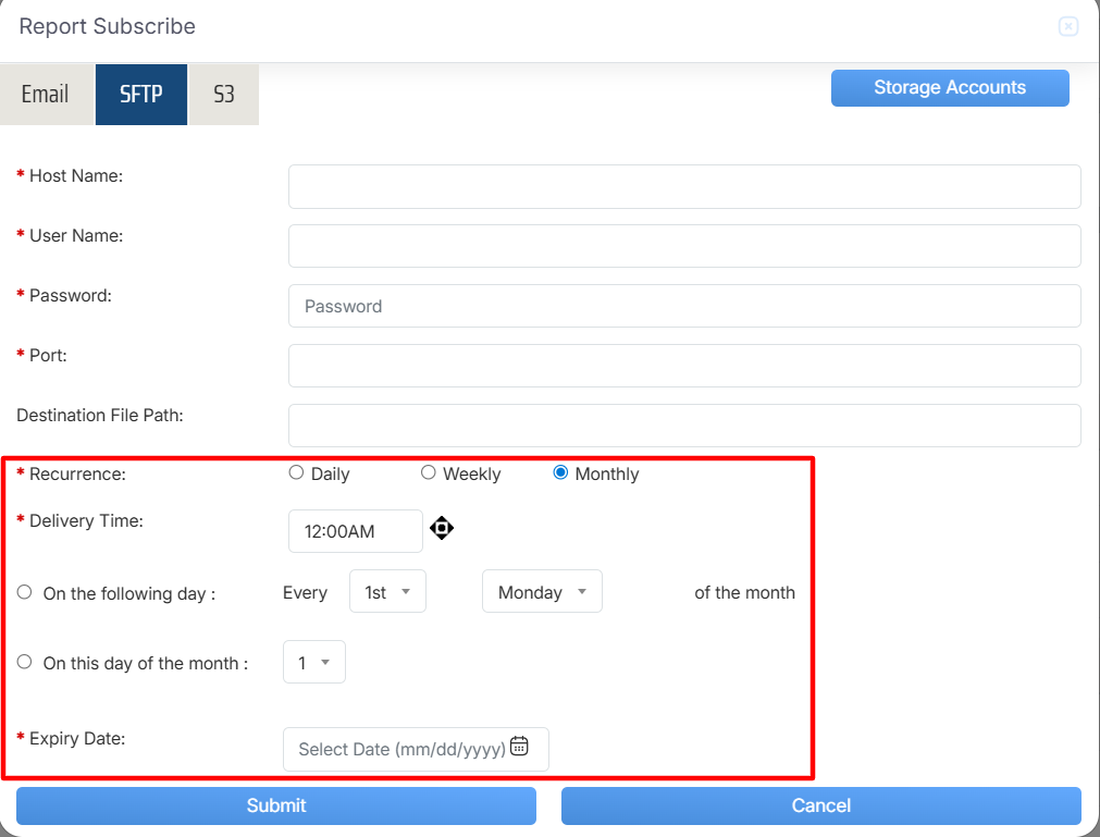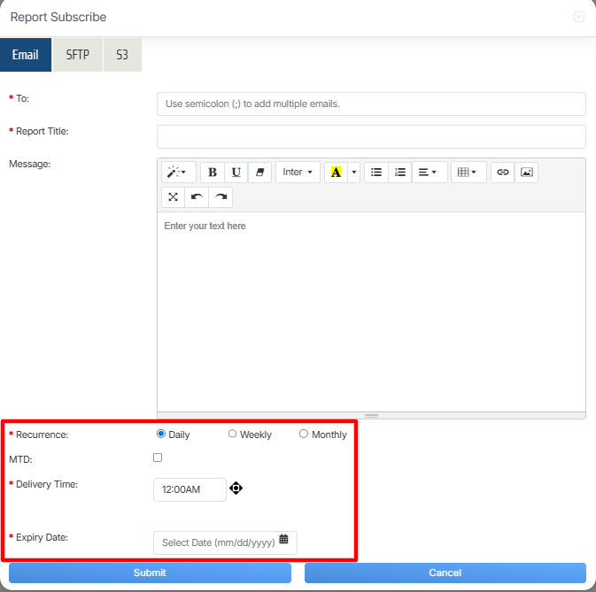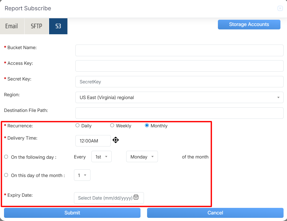 Once the necessary details are configured, click on the Submit button to subscribe the report or click on the Cancel button to discard the process.