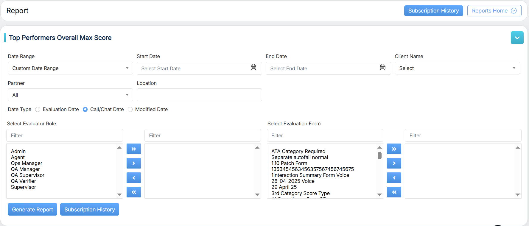 Evaluation Date: Select the radio button to search on basis of the Evaluation date. Call/Chat Date: Select the radio button to search on basis of call/chat date. Modified Date: Select the radio button to search on basis of the evaluation form modified date. |