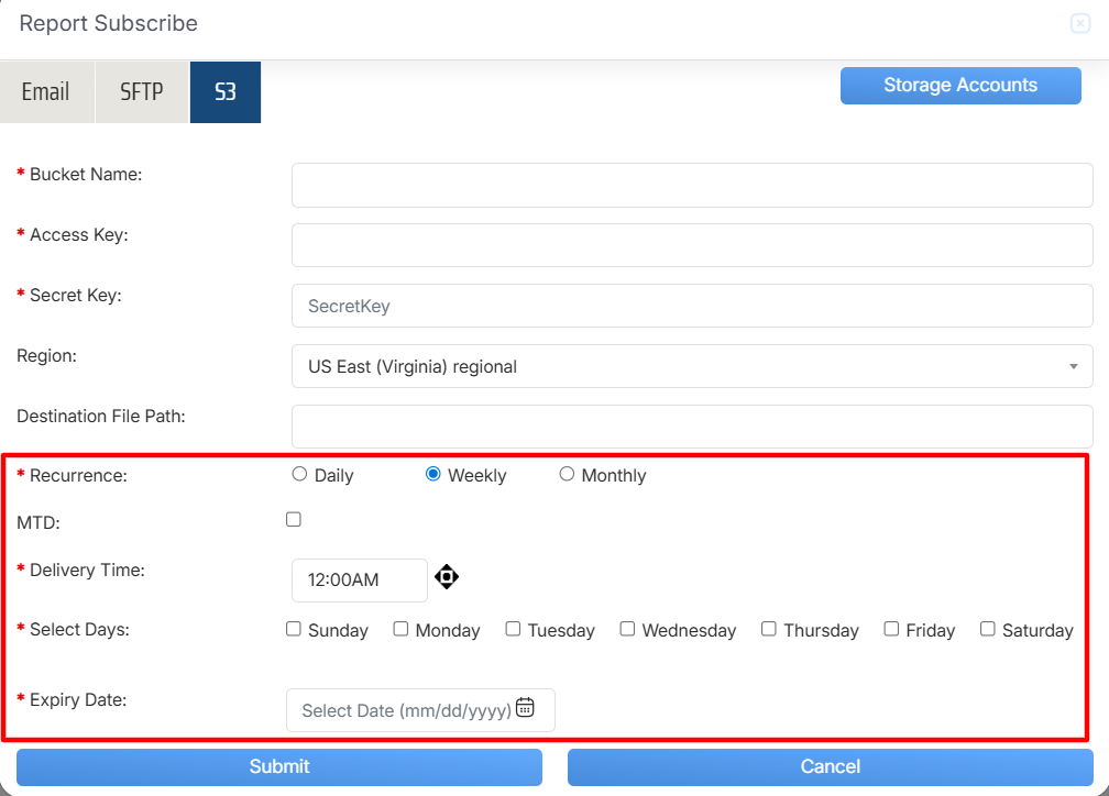 Now, click on “S3” button, from the window of Report Schedule as mentioned in below screenshot: